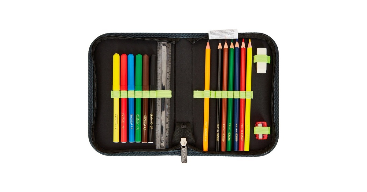 Schüleretui mit 16 Teilen, rundes Faulenzermäppchen, Sportbeutel, zwei austauschbare Applikationen mit Klettbefestigung (alles im passenden Look) | stabiler Boden mit Kunststoff-Füßen |