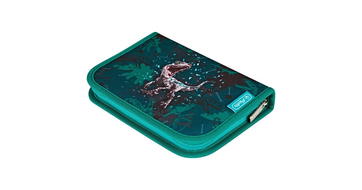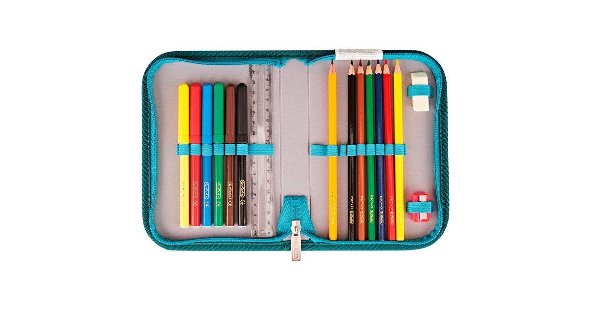 Schüleretui mit 16 Teilen, rundes Faulenzermäppchen, Sportbeutel, zwei austauschbare Applikationen mit Klettbefestigung (alles im passenden Look) | stabiler Boden mit Kunststoff-Füßen |