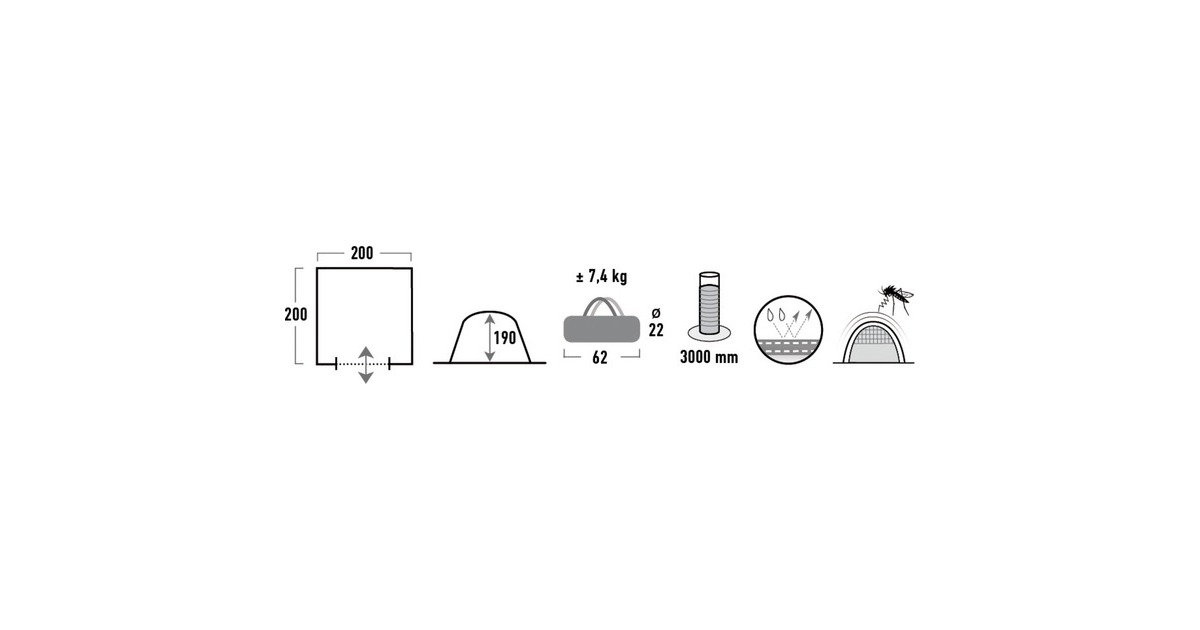 Gestänge: Fiberglas 11mm / Stahl 19mm, Extra robuste Reißverschlüsse, eingenähter Boden, Hochentlüfter, ABS-Winkel |