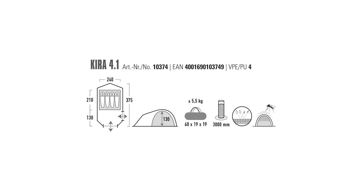 Das High Peak 4-Personen-Kuppelzelt Kira 4.1 bietet einen wettergeschützten Vorraum mit zwei Eingängen und sorgt für einen trockenen Schlafraum, auch bei Schlechtwetterperioden. Der große Vorbau bietet einen wasserdichten Boden, Klarsichtfolienfenster und hat einen zusätzlichen Seiteneingang, das sorgt für mehr Bewegungsfreiheit. Der formschöne und funktionale Eingang lässt sich bequem zur Seite rollen. Der Vorbau bietet Stauraum für reichlich Gepäck und Campingausrüstung. Die Aluminium-Beschichtung stärkt das Außenzeltgewebe, ist bis zu ca. 17% wärmereduzierend und bietet einen UV-Sonnenschutzfaktor von 80 (UV Standard 801). Der Zeltstoff ist zusätzlich mit einer Fluorcarbon (PFC)-freien wasserabstoßenden Imprägnierung (DWR) an der Zelthaut-Außenseite ausgerüstet. Der Gazeeingang hält lästige Insekten fern und kann bequem von innen, je nach Klima, variabel bedient werden. Die Abdecklappe verstaut man einfach in einer Tasche. Das lästige Aufrollen gehört damit der Vergangenheit an. Das Advanced Low Vent System ist eine sehr effektive Bodenventilation und zirkuliert die Luft im Bodenbereich an zwei Seiten, auch bei schlechtem Wetter. Der extra große Abstand zwischen Außenzelt und Innenzelt reduziert dabei Kondensation. Pfiffig ist die Bedienung des Advanced Low Vent Systems vom Innenzelt aus mittels Reißverschluss, ohne dass man aus dem Schlafsack muss. So ist das abgedunkelte Innenzelt auch bei geschlossenem Vario Vent Control System richtig klimatisiert. Die Innenzelttaschen für Utensilien und ein praktischer Lampenhalter für eine Campinglaterne oder eine Taschenlampe machen das Kira sehr komfortabel. Die Nähte sind mit Nahtband wasserdicht versiegelt und bieten eine bessere Naht-Reißfestigkeit. Die stabilen 5mm Durchmesser Stahl-Erdnägel verbiegen sich auch bei hartem Untergrund nicht. Das Kira 4.1 ist der richtige Begleiter für 3 bis 4 Personen. Es ist ein ideales Zelt für preisbewusste Naturliebhaber und eignet sich perfekt für den Campingurlaub oder ein Wochenende am See.Art.-Nr.: 100031833
