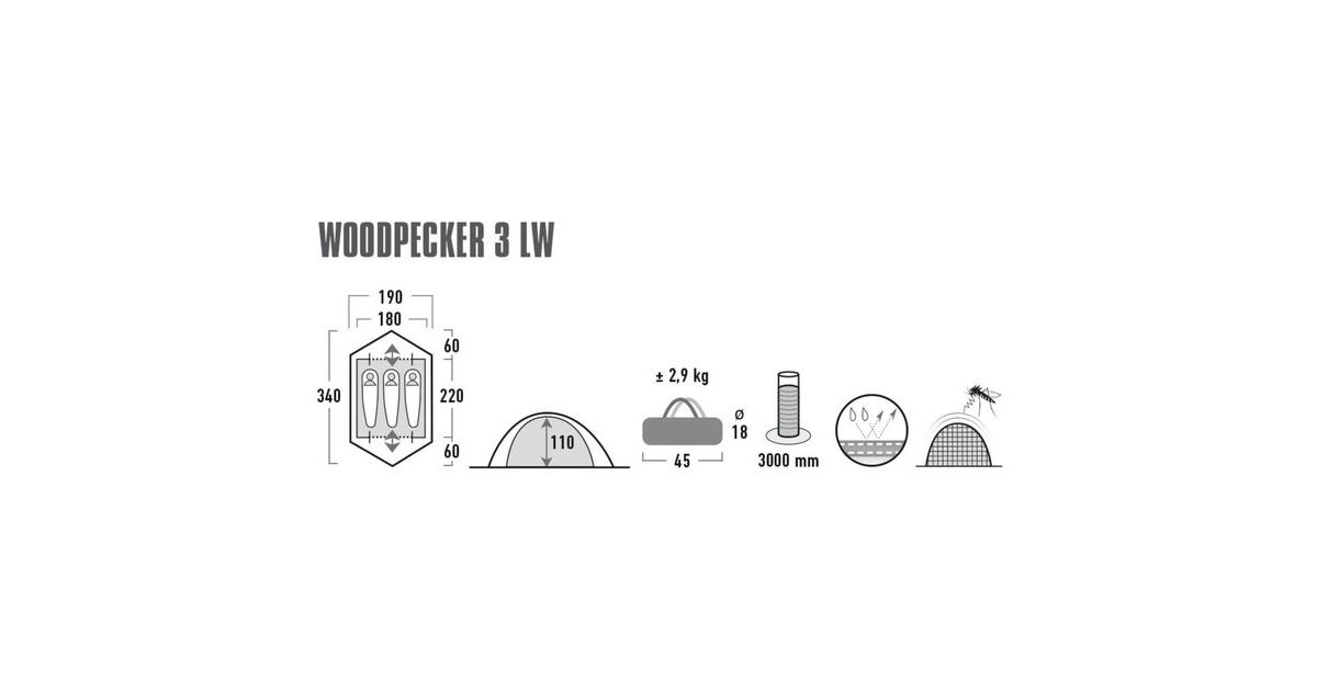 Das Active Zelt Woodpecker 3 LW von High Peak ist ein freistehendes Trekking-Kuppelzelt mit hochwertigem, federleichtem Aluminiumgestänge. Es wiegt nur 2,9kg und hat ein sehr kleines Packmaß. Das Innenzelt ist für einen schnellen Aufbau bereits eingehängt, so ist es vor Regen während des Aufbaus geschützt. Der Wannenboden ist am Innenzelt fest vernäht. Die beiden wettergeschützten Eingänge halten das Innenzelt trocken. Zwei Dauerventilationen belüften das Zelt bei jeder Wetterlage optimal und sollten immer geöffnet sein. Das Innenzelt des Woodpecker 3 LW ist mit zwei Anti-Moskito-Türen ausgestattet, die vor Insekten schützen und gleichzeitig das Innenzelt optimal belüften. Der Lampenhalter und praktische Innentaschen machen das kleine Zelt sehr komfortabel. Die innenliegenden Verbindungshülsen des Aluminium-Gestänges bilden eine glatte Außenfläche und laufen perfekt, ohne zu verhaken, durch die Gestängekanäle. Das flexible Gestänge gibt dem Zelt außerdem eine hohe Windstabilität. Extra leichte und stabile Aluminium Erdnägel verankern das Zelt und die Spannleinen sicher im Boden. Der rote Bodenstreifen ist auch in der Dämmerung gut sichtbar. Das Woodpecker 3 LW bietet bis zu drei Personen Unterkunft und hat Platz für Gepäck in zwei trockenen Vorräumen. Damit ist es bestens geeignet für Trekkingtouren, Rucksackreisen oder Fahrrad- und Motoradtouren, außerdem für alle Camper, die auf unnötiges Gewicht und sperriges Packmaß gerne verzichten.Art.-Nr.: 1692113