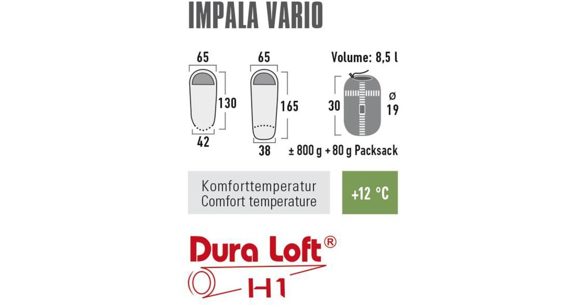 Der Schlafsack Impala Vario ist ein Kinder Mumienschlafsack mit Kapuze. Das kuschelige Material und die hochwertige Dura Loft Kunstfaser Füllung isoliert auch noch im feuchten Zustand und trocknet schnell. Die Dura Loft lässt sich leicht komprimieren und hat eine hohe Lebensdauer. Der Schlafsack ist verlängerbar von 135-165 cm mittels Reißverschluss.Art.-Nr.: 1593731