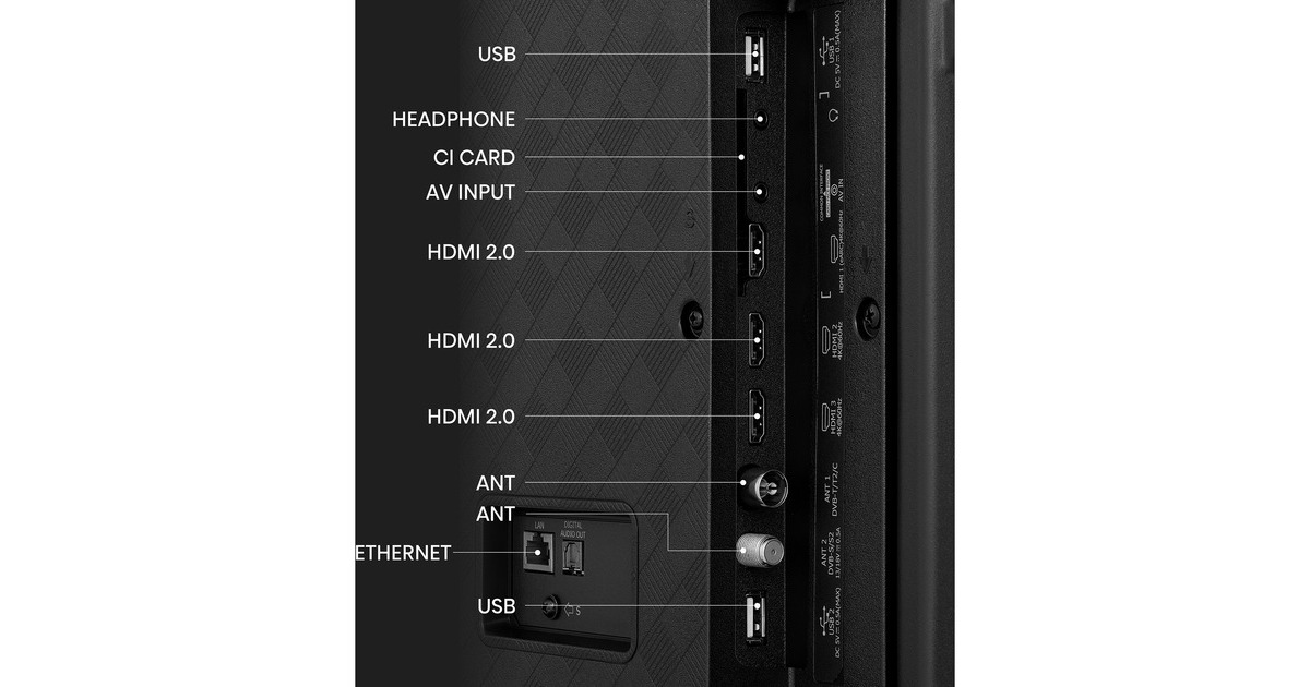 3x HDMI-Eingang, 1x Kopfhörer-Ausgang, 2x USB-A-2.0, 1x RJ 45, 1x CI+, 1x Optisch-Out |