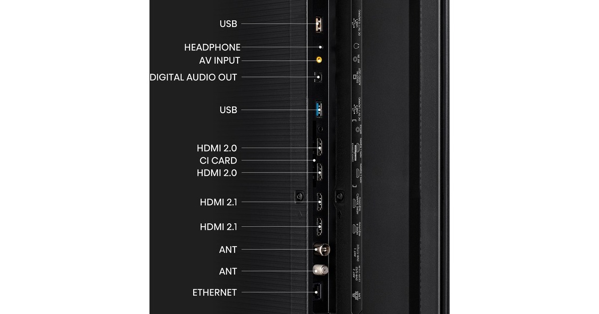 1x Antenne-In, 1x LNB-In, 4x HDMI-Eingang, (HDMI-Version: 2.1), 1x Kopfhörer-Ausgang, 1x USB-A-2.0, 1x USB-A 3.2 Gen 1 (5 Gbit/s), 1x RJ 45, 1x CI+, 1x Optisch-Out |