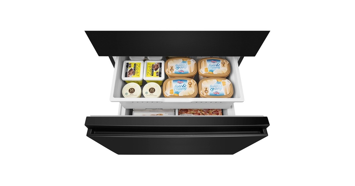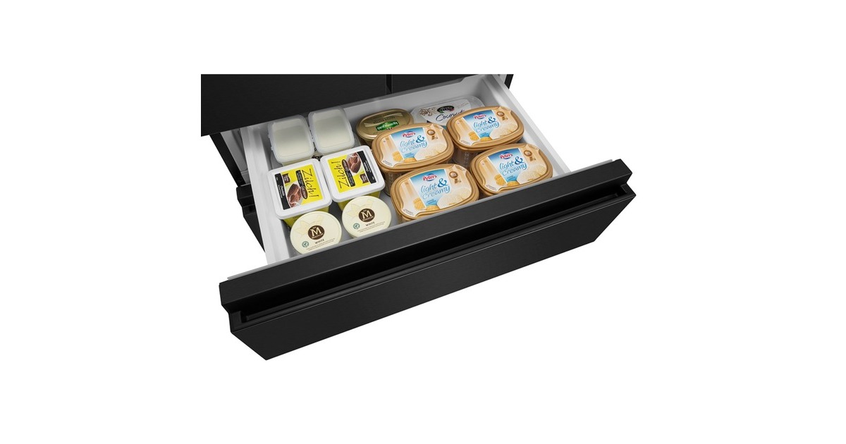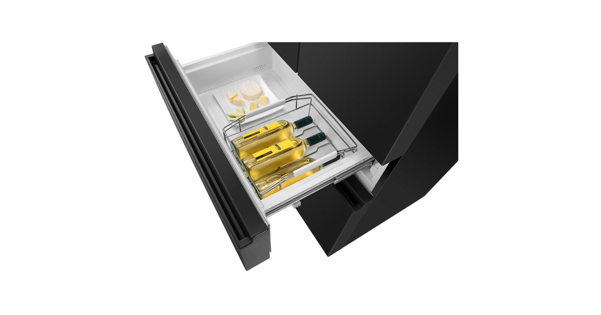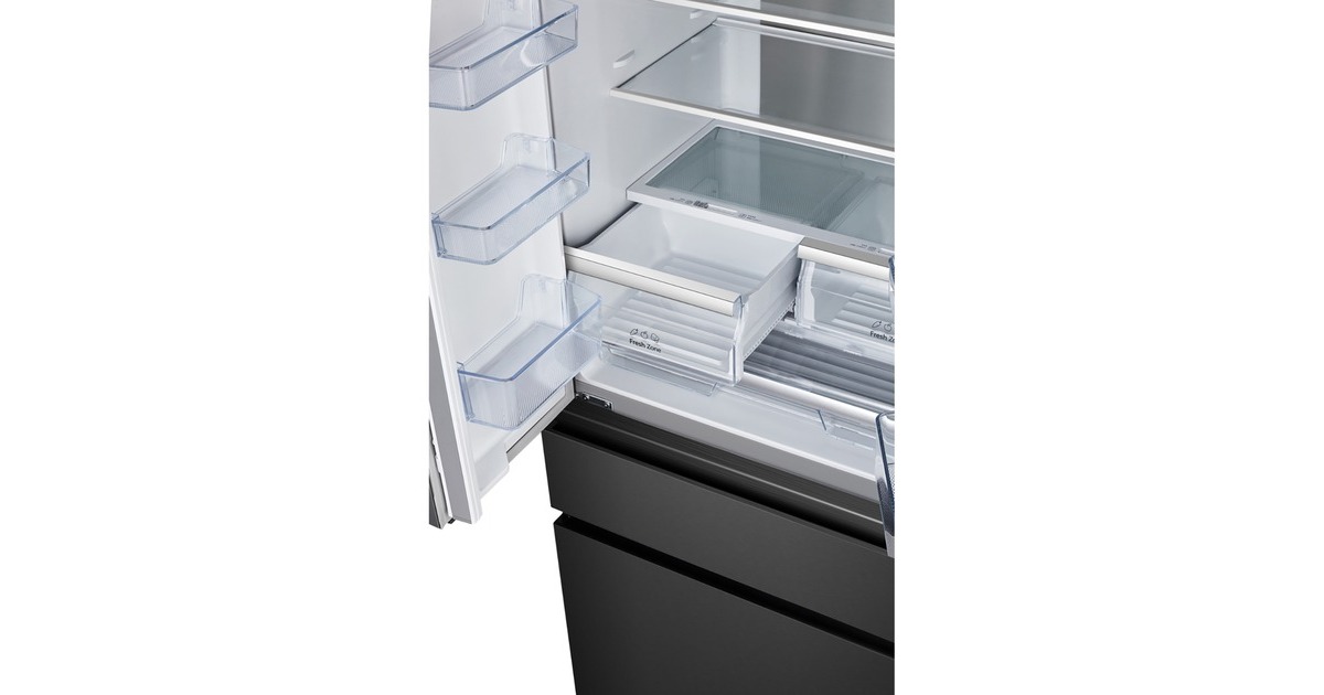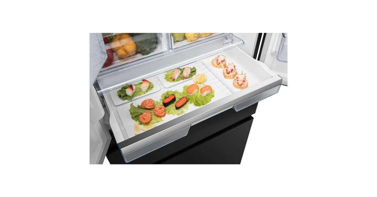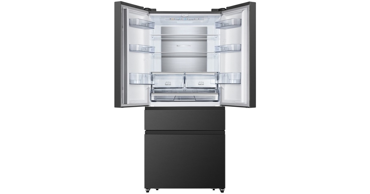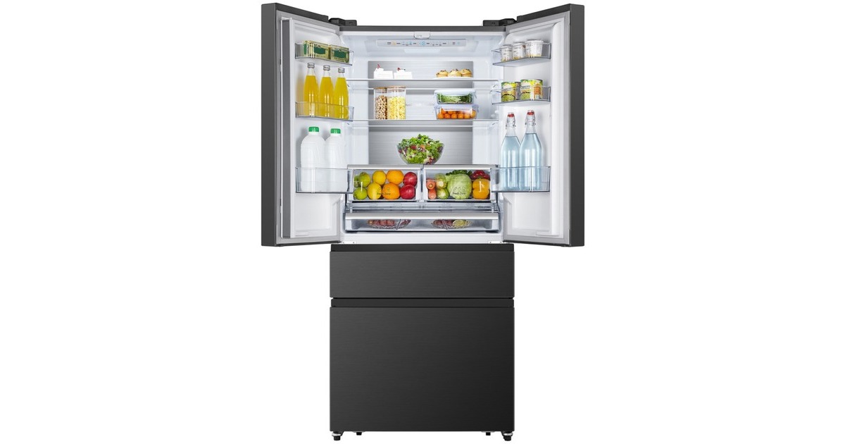Der French-Door-Kühlschrank Hisense RF540N4SBF2 besticht mit seinem großzügigen Gesamtnutzinhalt von 480 Litern und zahlreichen Funktionen. Das 302 Liter umfassende Kühlteil stellt drei breite Abstellflächen aus Sicherheitsglas, zwei Obst-/Gemüseschubladen, davon ein Moisture Fresh Crisper mit Feuchteregelung, sowie sechs Türfächern für die übersichtliche Lagerung frischer Lebensmittel zur Verfügung. Das Gefrierteil bietet einen Nutzinhalt von 178 Litern und besteht aus zwei Gefrierschubladen, die sich bequem von außen öffnen lassen. Das einzigartige My Fresh Choice-Fach erlaubt Nutzern, die Temperatur von -18 °C bis +5 °C individuell einzustellen und damit dessen Funktion frei zu wählen. Die No-Frost-Technologie sorgt für eine intensive Zirkulation der kalten Luft und verhindert somit Eisbildung, wodurch manuelles Abtauen der Vergangenheit angehört. Das MultiAirflow-System sorgt für eine gleichmäßige Verteilung der kühlen Luft und eine konstante Temperatur im gesamten Kühlschrankinnenraum und die SuperKühlen- und SuperGefrieren-Funktion machen das Einlagern wärmerer Lebensmittel besonders effizient. Mit einem Stromverbrauch von 310 kWh im Jahr ist der RF540N4SBF2 in die Energieeffizienzklasse E eingestuft.Art.-Nr.: 1755909