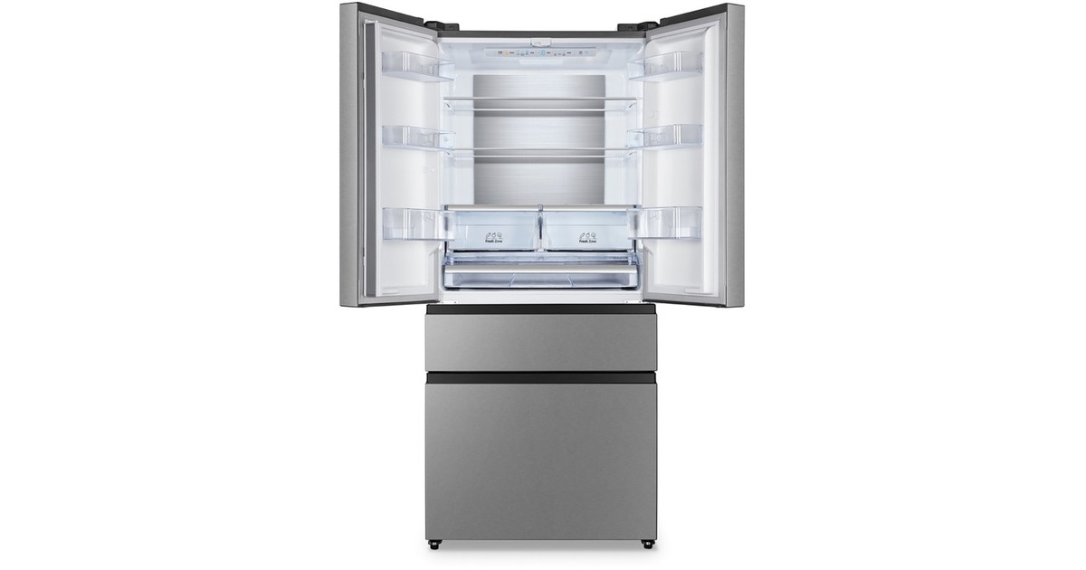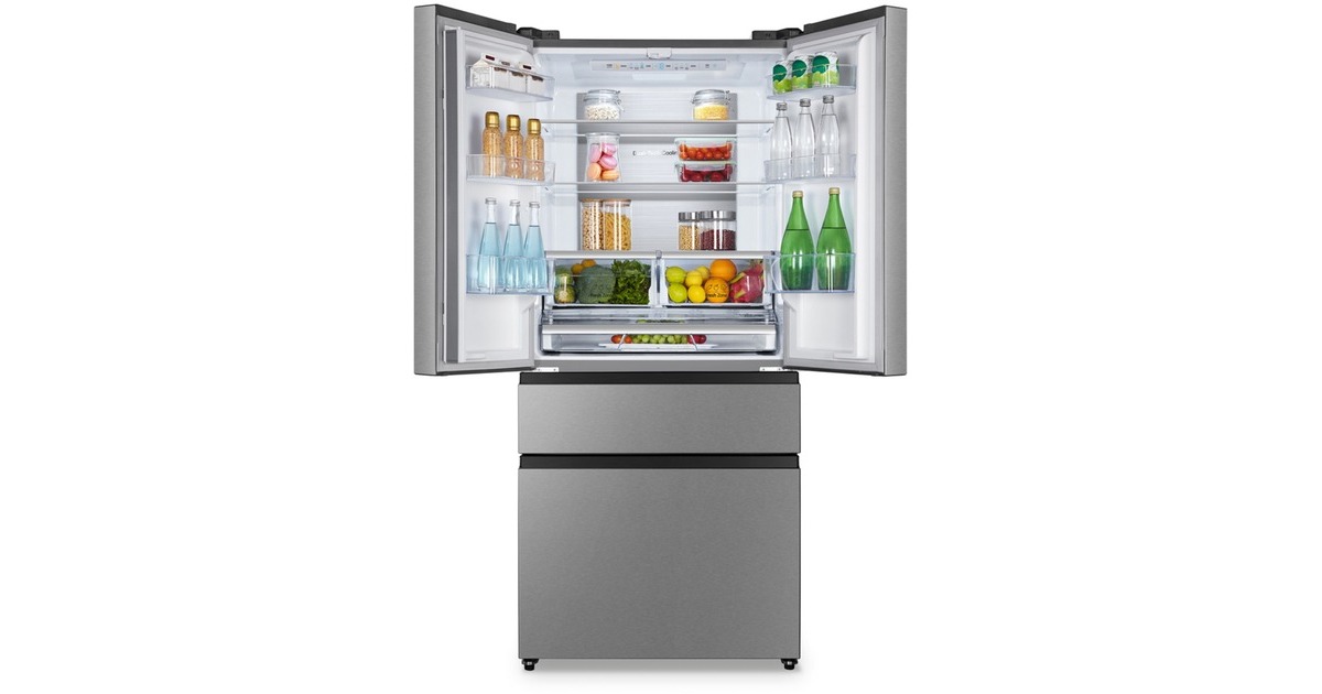 Der French-Door-Kühlschrank Hisense RF540N4SBI2 besticht mit seinem großzügigen Gesamtnutzinhalt von 480 Litern und zahlreichen Funktionen. Das 302 Liter umfassende Kühlteil stellt drei breite Abstellflächen aus Sicherheitsglas, zwei Obst-/Gemüseschubladen, davon ein Moisture Fresh Crisper mit Feuchteregelung, sowie sechs Türfächern für die übersichtliche Lagerung frischer Lebensmittel zur Verfügung. Das Gefrierteil bietet einen Nutzinhalt von 178 Litern und besteht aus zwei Gefrierschubladen, die sich bequem von außen öffnen lassen. Das einzigartige My Fresh Choice-Fach erlaubt Nutzern, die Temperatur von -18 °C bis +5 °C individuell einzustellen und damit dessen Funktion frei zu wählen. Die No-Frost-Technologie sorgt für eine intensive Zirkulation der kalten Luft und verhindert somit Eisbildung, wodurch manuelles Abtauen der Vergangenheit angehört. Das MultiAirflow-System sorgt für eine gleichmäßige Verteilung der kühlen Luft und eine konstante Temperatur im gesamten Kühlschrankinnenraum und die SuperKühlen- und SuperGefrieren-Funktion machen das Einlagern wärmerer Lebensmittel besonders effizient. Mit einem Stromverbrauch von 310 kWh im Jahr ist der RF540N4SBI2 in die Energieeffizienzklasse E eingestuft.Art.-Nr.: 1911269