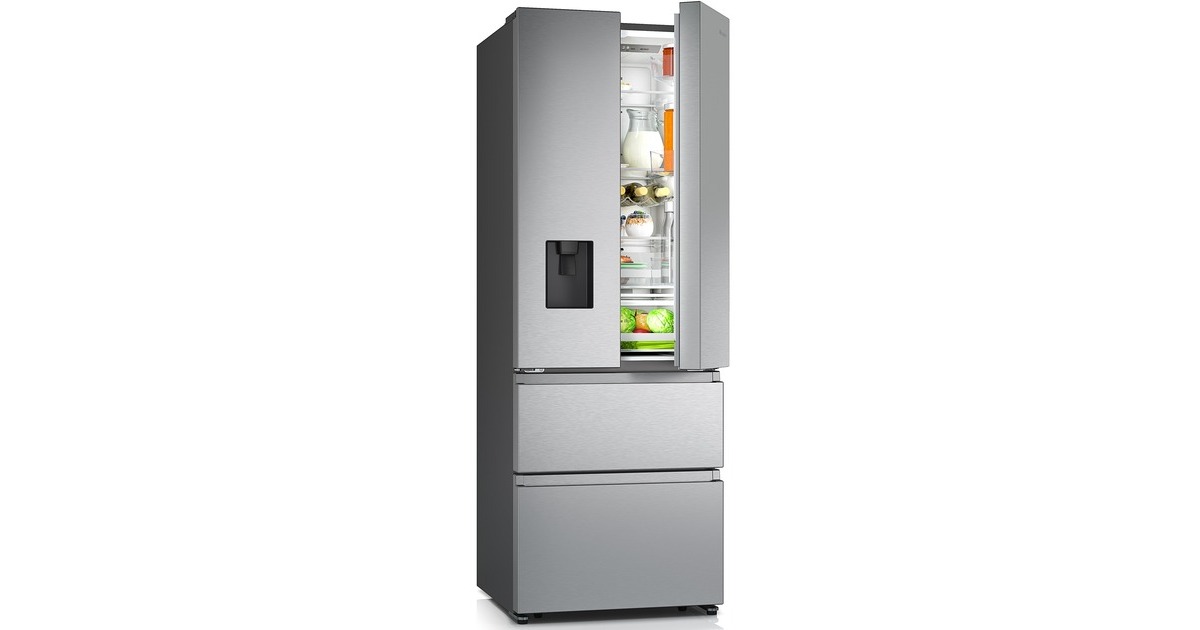 Der French-Door-Kühlschrank Hisense RF632N4WIE besticht mit seinem großzügigen Gesamtnutzinhalt von 485 Litern und zahlreichen Funktionen. Das 336 Liter umfassende Kühlteil stellt drei breite Glasabstellflächen, zwei Obst-/Gemüseschubladen, davon eine mit Feuchteregelung, sowie mehrere Türfächer für die übersichtliche Lagerung frischer Lebensmittel zur Verfügung. Das Gefrierteil bietet einen Nutzinhalt von 149 Litern und besteht aus zwei Gefrierschubladen, die sich bequem von außen öffnen lassen. Die NoFrostPlus-Technologie sorgt für eine intensive Zirkulation der kalten Luft und verhindert somit Eisbildung, wodurch manuelles Abtauen der Vergangenheit angehört. Das MultiAirflow-System ermöglicht für eine gleichmäßige Verteilung der kühlen Luft und eine konstante Temperatur im gesamten Kühlschrankinnenraum und die SuperKühlen- und SuperGefrieren-Funktion machen das Einlagern wärmerer Lebensmittel besonders effizient. Angenehm komfortabel ist zudem der Wasserspender mit integriertem Wassertank. Mit einem Stromverbrauch von 295 kWh im Jahr ist der RF632N4WIE in die Energieeffizienzklasse E eingestuft.Art.-Nr.: 1755914