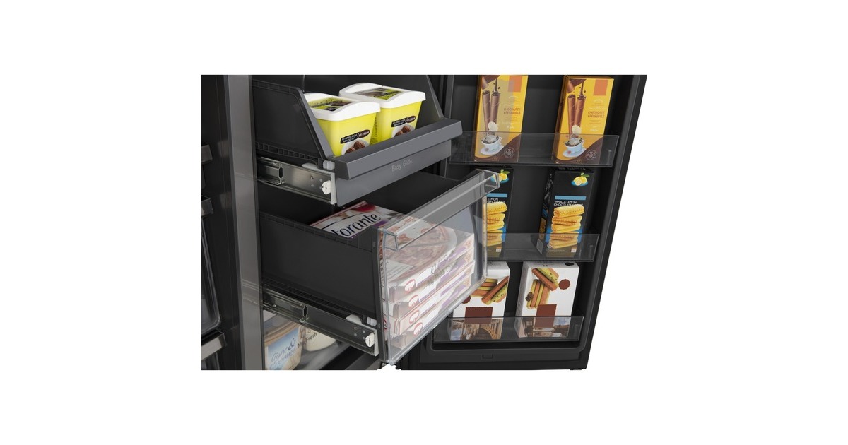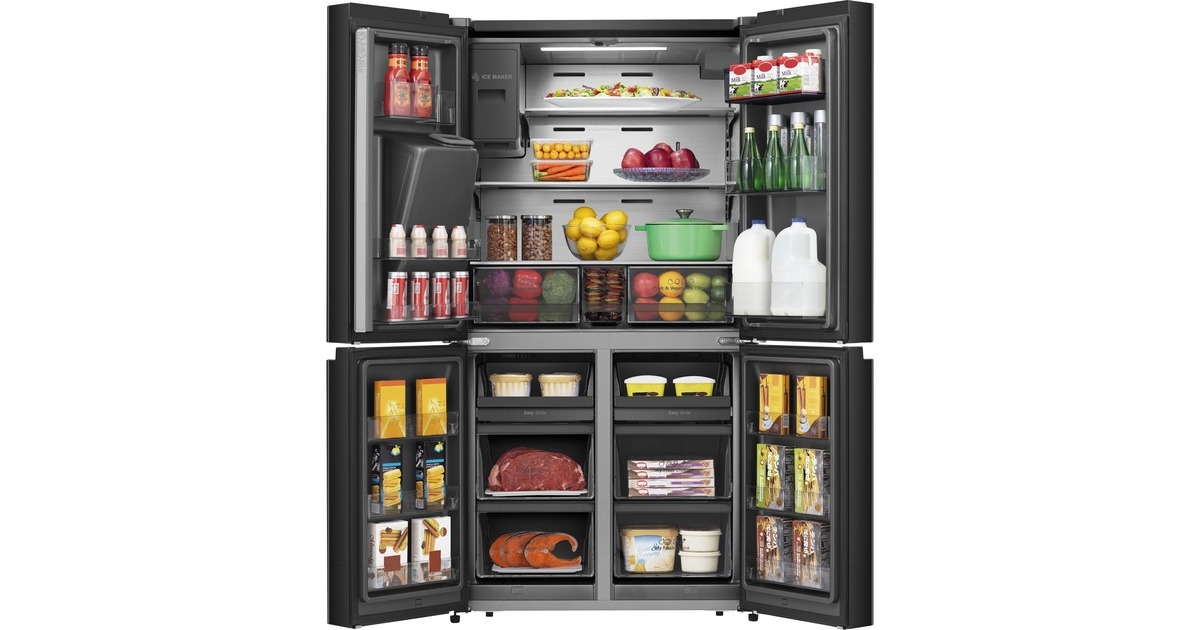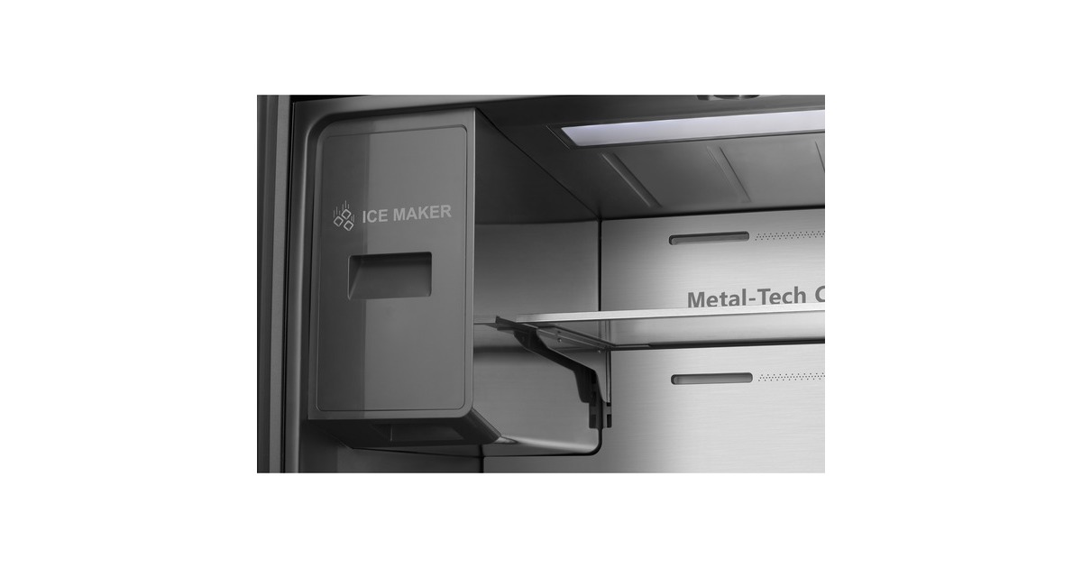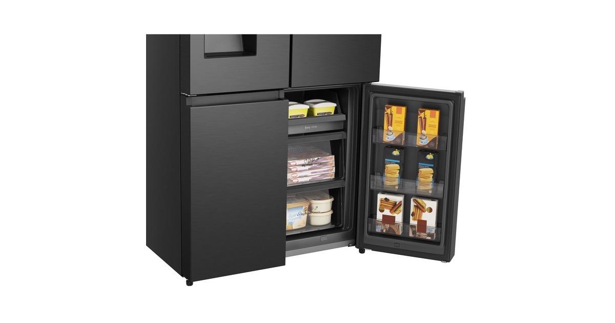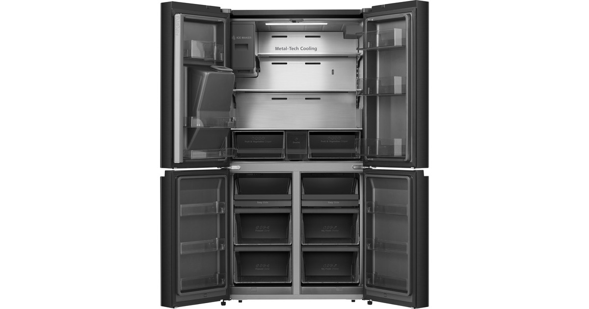 Der French-Door-Kühlschrank Hisense RQ760N4BFE besticht mit seinem großzügigen Gesamtnutzinhalt von 584 Litern und zahlreichen Funktionen. Das 352 Liter umfassende Kühlteil stellt zwei Glasabstellflächen, zwei Obst-/Gemüseschubladen, eine FreshZone sowie sechs Türfächern zur übersichtlichen Lagerung frischer Lebensmittel und Getränke zur Verfügung. Das Gefrierteil hat ein Volumen von 232 Liter und bietet mit seinem Multi-Schubladen-Design sowie sechs Türfächern jede Menge Platz für Tiefkühlkost. Dank NoFrostPlus muss man sich keine Gedanken mehr über das Abtauen machen und Multiflow 360° sorgt für eine optimale Luftzirkulation im gesamten Gerät. Das von außen zugängliche LED-Display zeigt auf einen Blick die eingestellte Temperatur und alle wichtigen Funktionen, wie SuperKühlen, SuperGefrieren, die Urlaubsschaltung und den EcoMode. Der Wasserspender mit Wassertank ermöglicht gekühltes Wasser auf Knopfdruck. Mit einem Stromverbrauch von 352 kWh im Jahr ist der RQ760N4BFE in die Energieeffizienzklasse E eingestuft.Art.-Nr.: 1880956