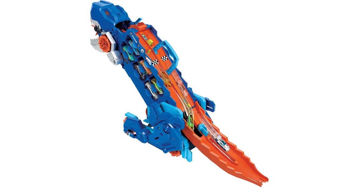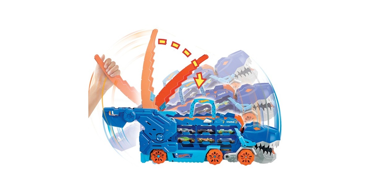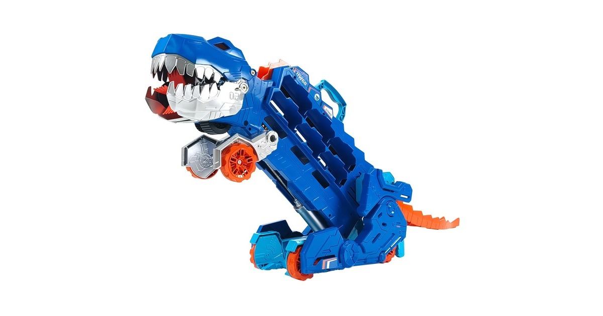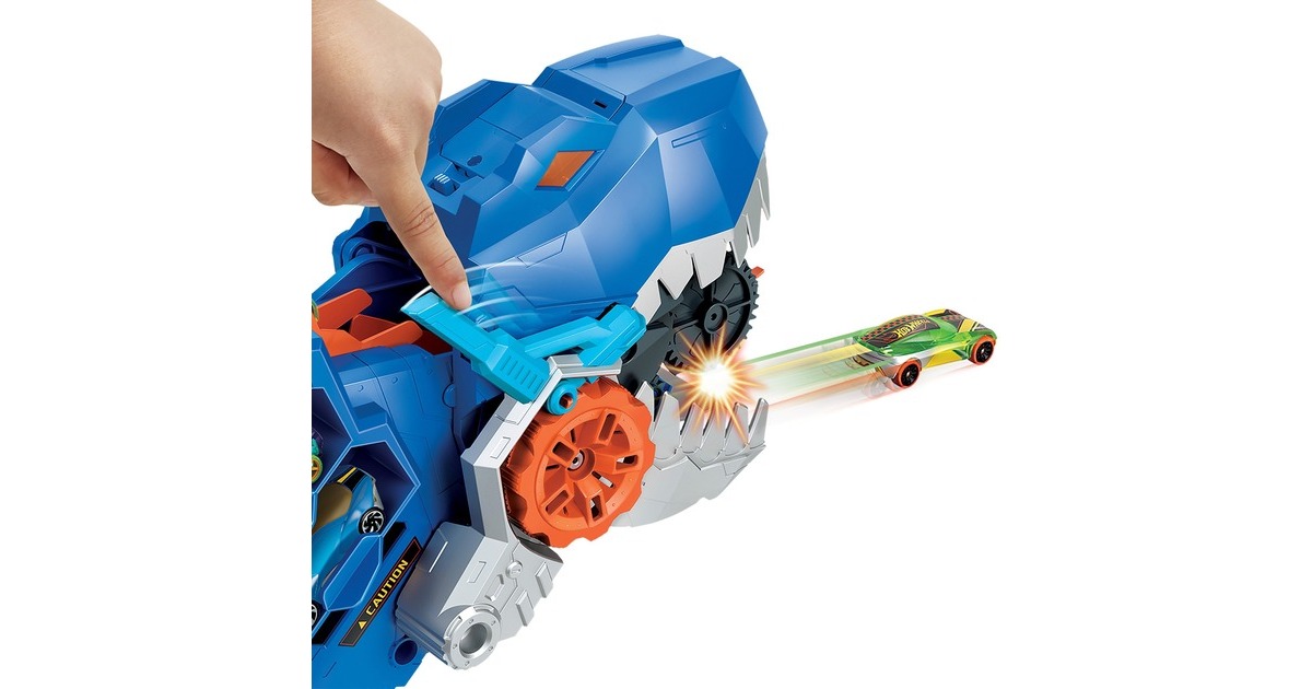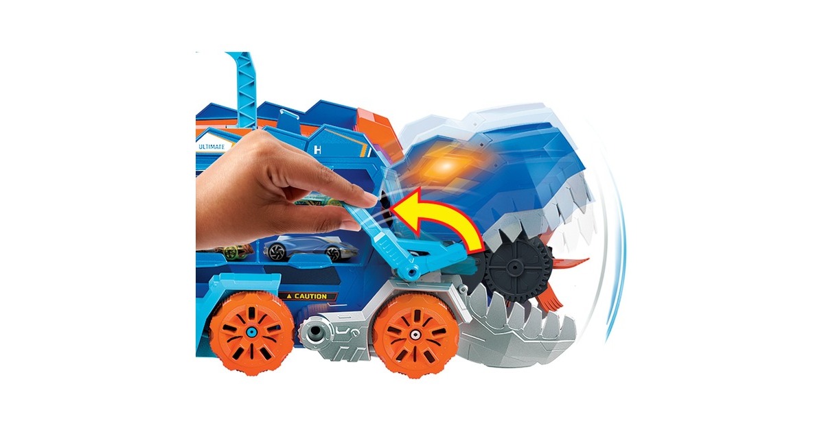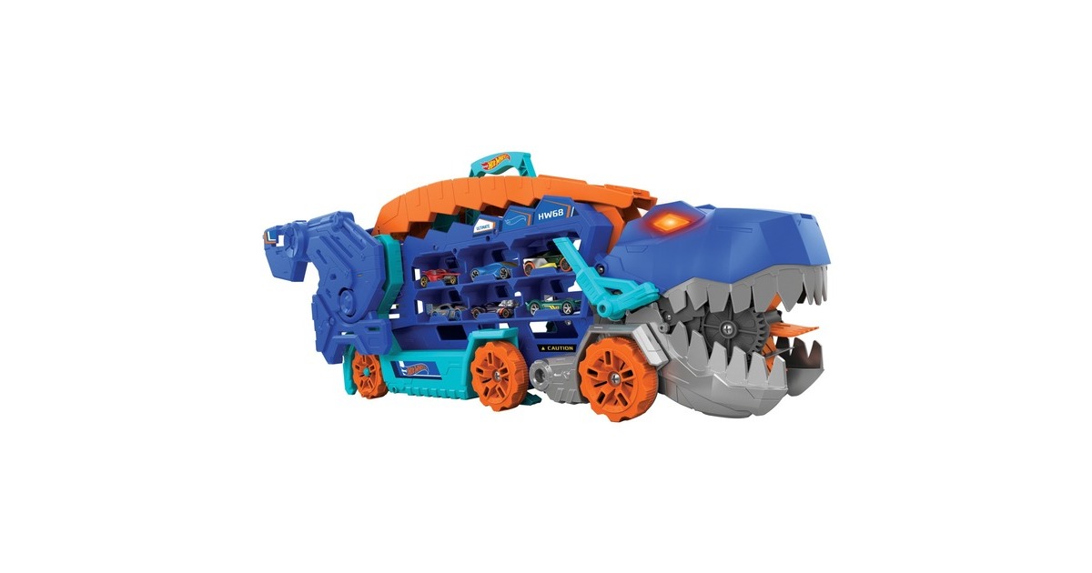 Der Hot Wheels City Ultimative Transporter kann mehr als 20 Autos im Maßstab 1:64 verschlingen und in seinem Inneren aufbewahren. Außerdem verwandelt er sich in einen tobenden, stampfenden T-Rex mit Rennstrecke auf dem Rücken! Im Transportermodus verschlingt er beim Ziehen des Griffs alle Autos im Maßstab 1:64, die ihm in den Weg kommen. Durch Herabsenken des Schwanzes verwandelt er sich in einen Robo T-Rex mit Lichtern und Geräuschen sowie in eine zweispurige Rennstrecke. Die Autos können vom Maul aus ins Rennen starten. Enthält zwei Hot Wheels Autos im Maßstab 1:64.Art.-Nr.: 1919262