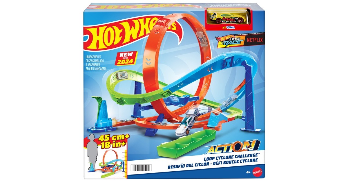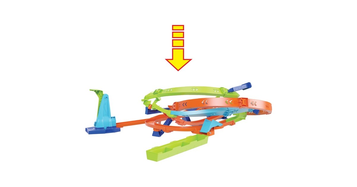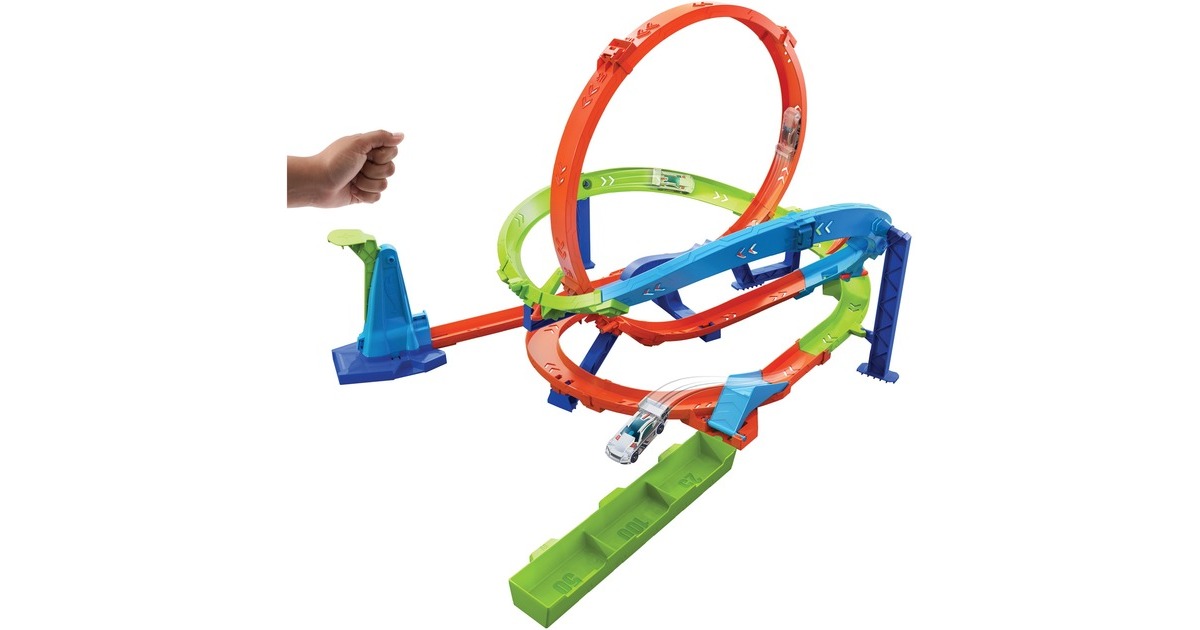 Mit diesem Hot Wheels-Rennset werden Rennen und Stunts auf einer neuen Ebene möglich. Es bietet zwei Spielmöglichkeiten: Einen Bumerang-Looping für mehrere Rennrunden oder eine Sprungschanze für spannende Stunts um Punkte. Beide Möglichkeiten führen die Autos mit hoher Geschwindigkeit durch atemberaubende Loopings und Kurven. Nach dem Spielen lässt sich das Set ganz einfach zusammenklappen: Die Seitenteile können einfach umgedreht und hochgeklappt werden. Auch ein Tragegriff ist vorhanden. Im Lieferumfang ist ein Hot Wheels-Fahrzeug im Maßstab 1:64 enthalten. Art.-Nr.: 100026133