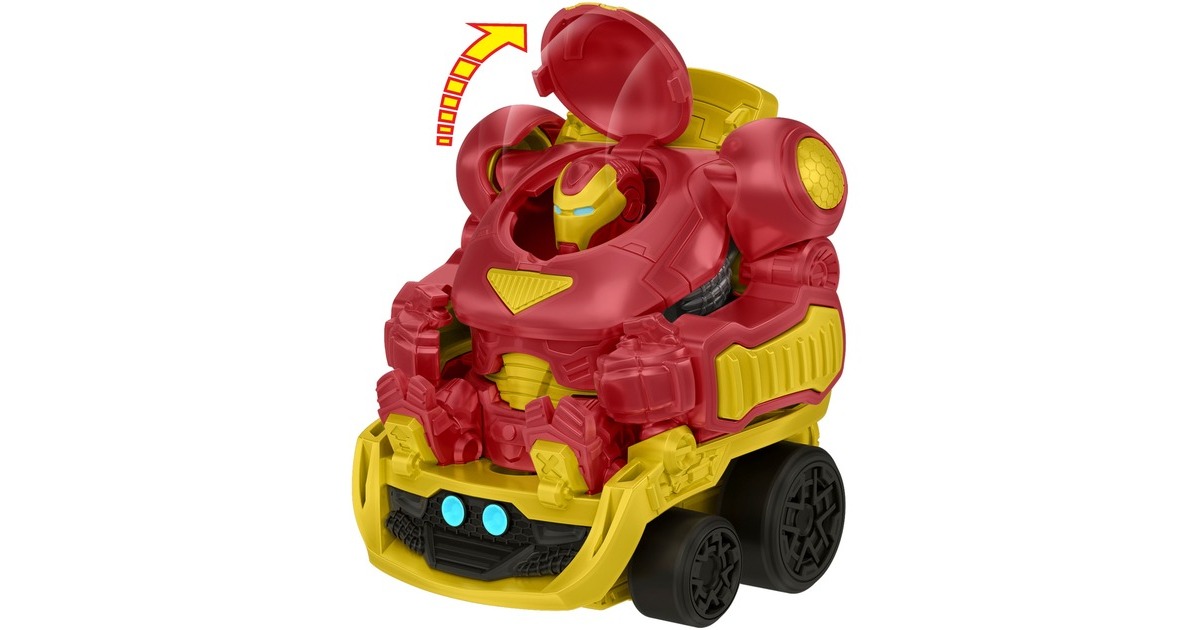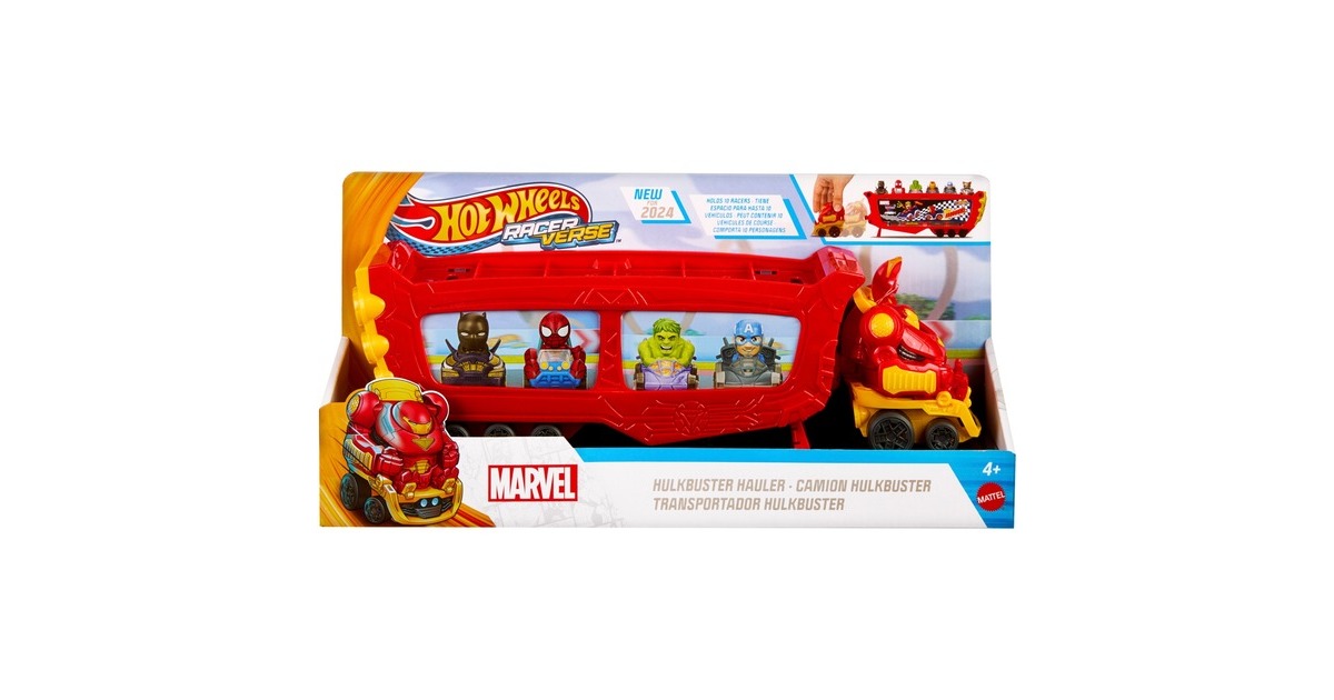 Dieser tolle Spielzeug-Transporter nimmt gleiche eine ganze Sammlung an Hot Wheels-Fahrzeugen auf: Der Racerverse Hulkbuster Hauler hat Platz für bis zu 10 Racerverse-Fahrzeuge oder Hot Wheels-Autos im Maßstab 1:64. Das Seitenteil mit dem coolen Aufdruck mit Marvel-Motiven kann zum Beladen aufgeklappt werden. Der Transporter ist etwa über 30 Zentimeter lang und verfügt über eine abnehmbare, separat fahrbare Fahrerkabine. Auch das Cockpit kann geöffnet werden, womit die nicht abnehmbare Tony Stark-Figur sichtbar wird. Art.-Nr.: 100026174