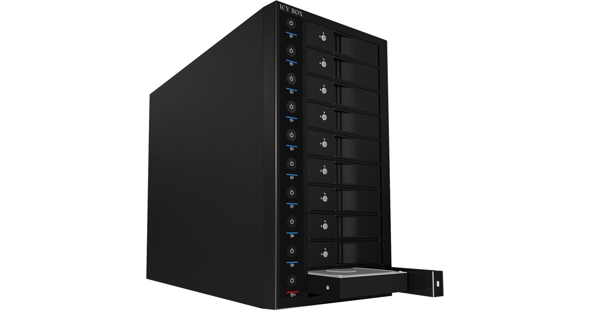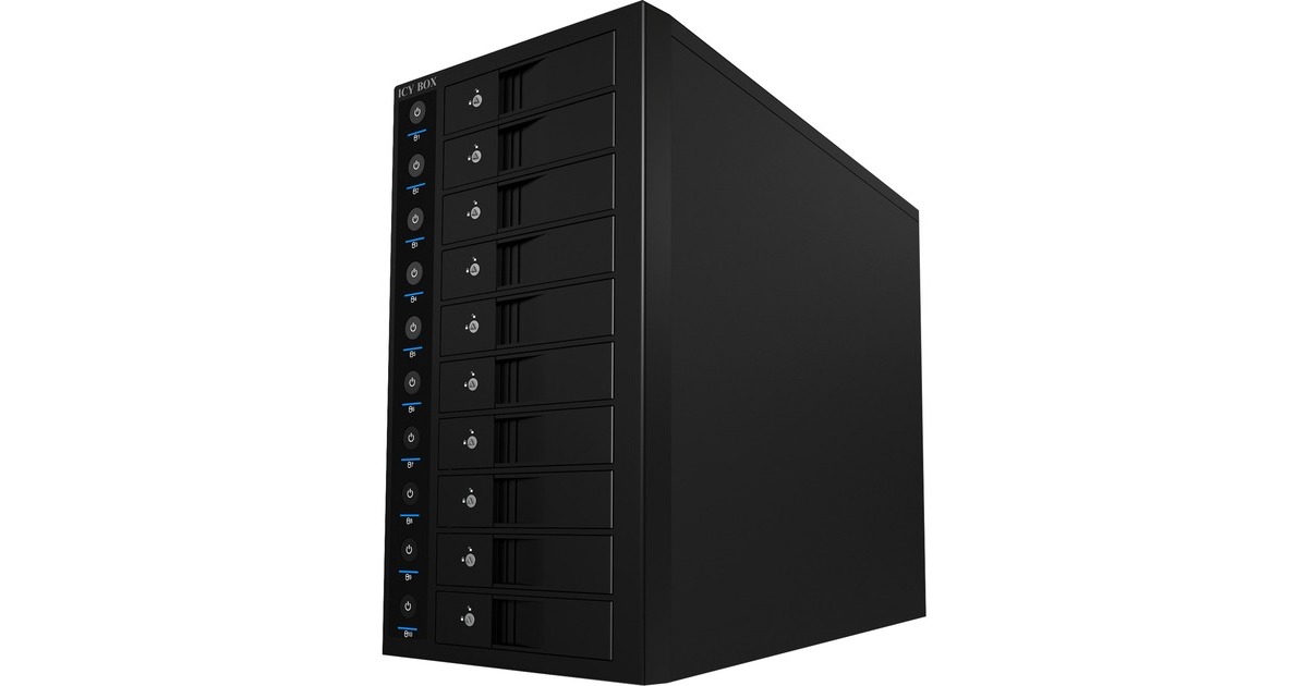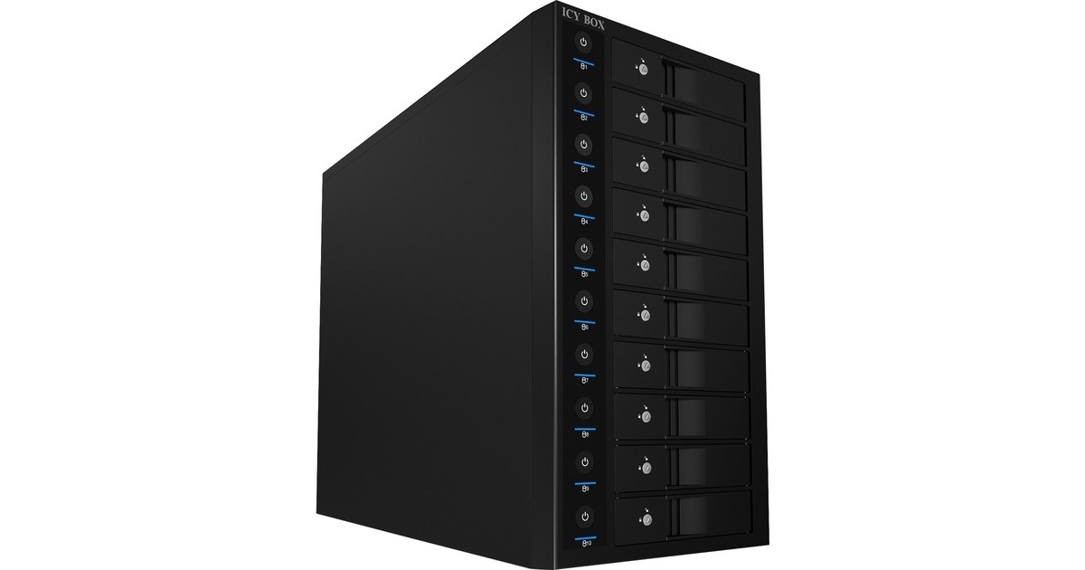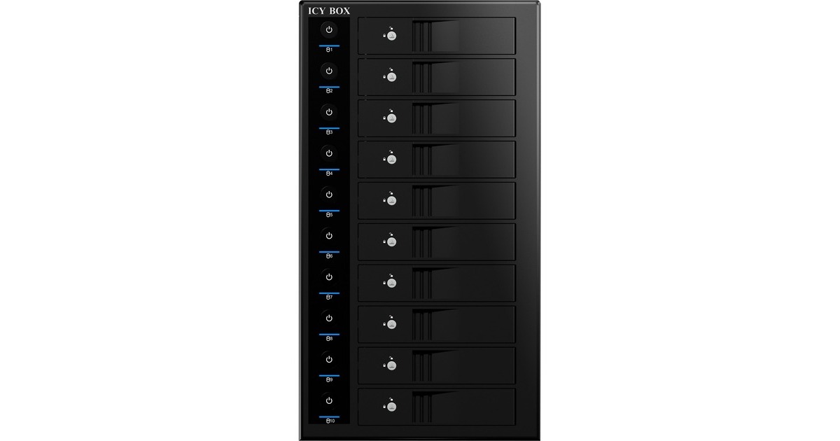Das externe SINGLE Gehäuse ICY BOX IB-3810U3 bietet Platz für insgesamt zehn SATA I/II/III Festplatten. Es besteht zum Großteil aus Stahl und ist daher stabil und leitet entstehende Wärme besonders gut ab. Die Kühlung der Laufwerke wird darüber hinaus durch einen großen 140 mm Lüfter auf der Rückseite und entsprechende Lufteinlässe an den Türen der Laufwerksschächte auf der Vorderseite unterstützt. Die Türen der einzelnen Einschübe sind abschließbar. Die LEDs des SINGLE Systems informieren über Betrieb und Festplattenverwendung. Als riesiger Datenspeicher kann dieses SINGLE System seine volle Funktion zur Schau stellen. Dabei spielt sowohl die darüber hinaus vorhandene externen Schnittstelle USB 3.2 mit UASP Unterstützung eine Rolle als auch die Möglichkeit, Festplatten ohne jegliche Kapazitätseinschränkungen nutzen zu können.Art.-Nr.: 1281561