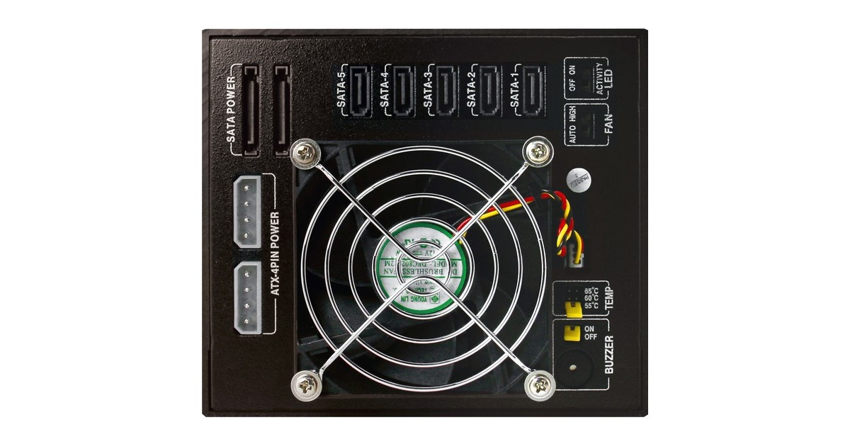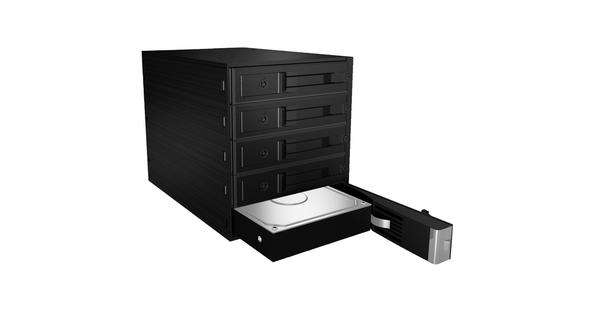 Aluminium, ein 80 mm-Lüfter, HotSwap-fähig; 4x 3,5" SAS/SATA III; LED: Betrieb (blau), Festplattenzugriff (orange), An/Aus, Alarm; Stromversorgung: 2x 4pin, 2x SATA Stromstecker; Maße: 220x148x127 mm; Gewicht: 1798 Gramm |