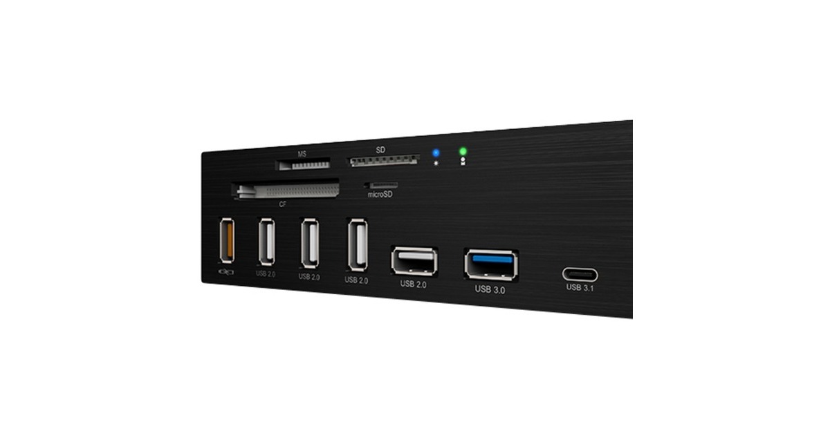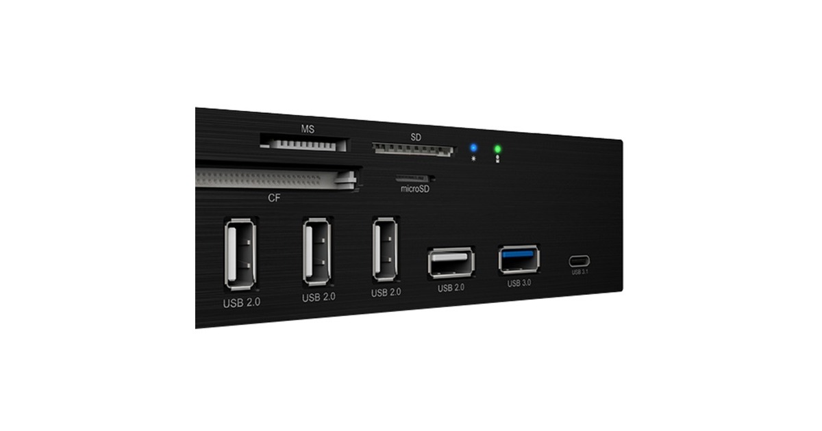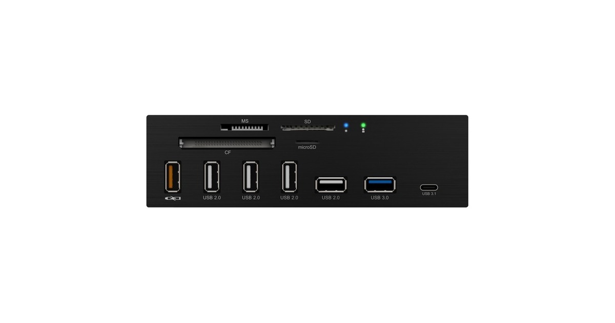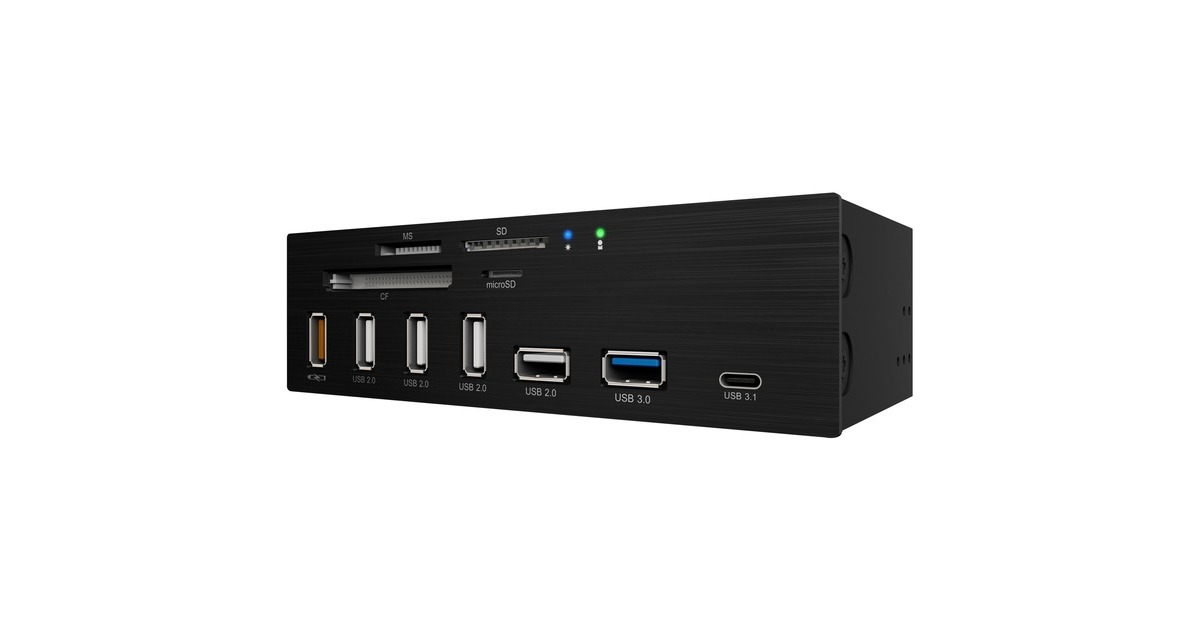 Mit 11 Anschlussmöglichkeiten ist der ICY BOX IB-867a ein echtes Multitalent. Ob Kartenleser, USB-Hub oder Charger, die Anwendungsmöglichkeiten sind groß. Als Kartenleser wird Multi-LUN für eine gleichzeitige Verwendung zweier Speicherkarten unterstützt. Mit SD, microSD, MS und CF werden alle gängigen Formate bedient. Beim IB-867a sind zudem alle USB-Generationen vereint: viermal USB-A 2.0 mit bis zu 480 Mbit/s, einmal USB-A 3.2 Gen 1 mit bis zu 5 Gbit/s und einmal USB-C 3.2 Gen 2 mit bis zu 10 Gbit/s. Dazu gibt es einen USB-A Ladeanschluss mit BC 1.2 Unterstützung. Der IB-867a passt perfekt in einen freien 5,25"-Schacht des Desktop-PCs. Da Laufwerke stets weniger verwendet werden, nutzt das ICY BOX Multi Frontpanel diesen freien Platz leistungsstark und sinnvoll aus. So bringt man Vielfalt an die PC-Front.Art.-Nr.: 100041108