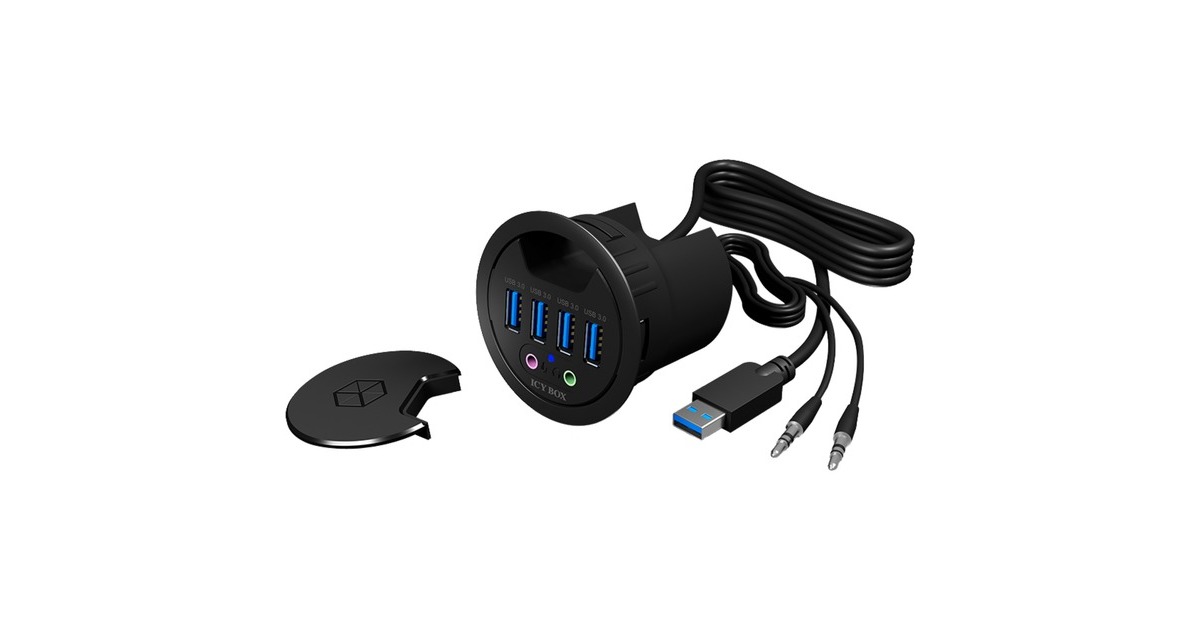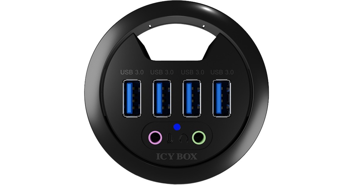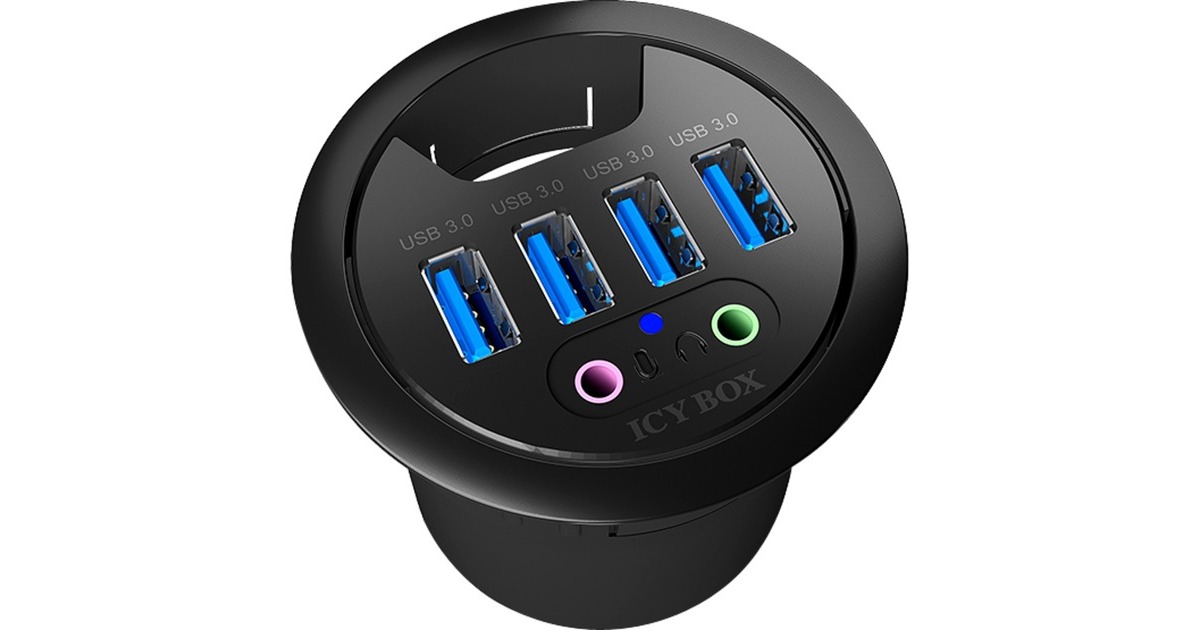 Der IB-HUB1403A ist zum Einsatz in der Kabeldurchführung (60 mm) von Schreibtischen gedacht. Er fügt sich werkzeuglos in vorhandene Löcher ein und bietet genug Platz, um mehrere Kabel durchzuführen. Der IB-HUB1403A bietet vier USB 3.0 Type-A Anschlüsse, um eine Vielzahl von Geräten anzuschließen. Die Audio In/Out Buchsen runden die Vielseitigkeit ab und erlauben das Anschließen von Kopfhörern oder anderen Audiogeräten. Art.-Nr.: 1417220