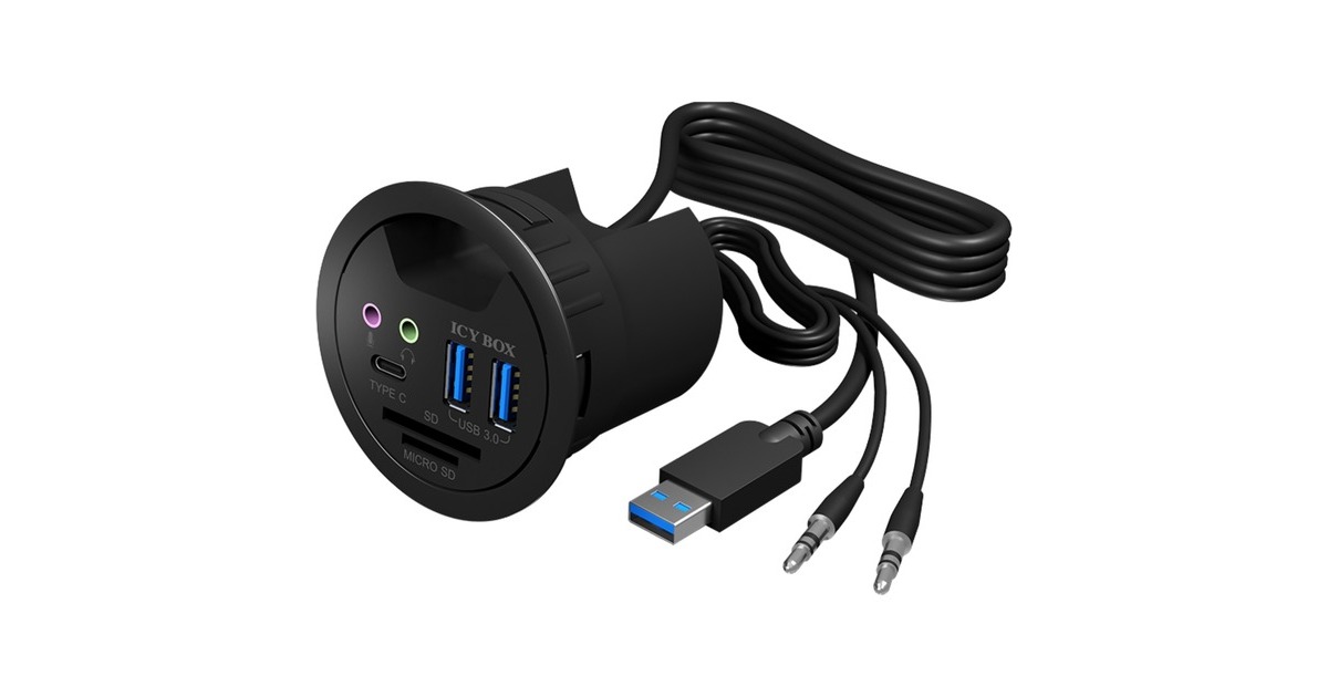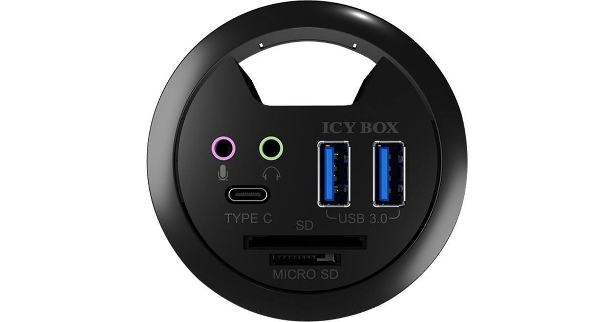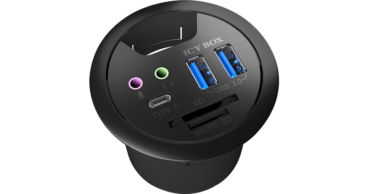 Der IB-HUB1404A ist zum Einsatz in der Kabeldurchführung (60 mm) von Schreibtischen gedacht. Er fügt sich werkzeuglos in vorhandene Löcher ein und bietet genug Platz, um mehrere Kabel durchzuführen. Der IB-HUB1404A bietet zwei USB 3.0 Type-A Anschlüsse, um eine Vielzahl von Geräten anzuschließen. Der SD/microSD-Kartenleser und die Audio In/Out Buchsen runden die Vielseitigkeit ab und als i-Tüpfelchen ist ein USB Type-C Anschluss vorhanden, mit dem auch die neuste Peripherie verbunden werden kann.Art.-Nr.: 1417223