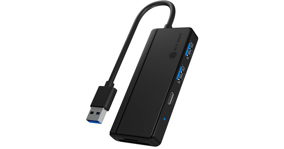 Der IB-HUB1423CR-U3 Hub von ICY BOX ist eine kleine, äußerst nützliche Ergänzung für ein Notebook. Mit einem klassischen USB-A-Anschluss kann man einfach mit Plug & Play andocken und hat sofort Kartenleser sowie weitere USB-Anschlüsse zur Verfügung, darunter auch einen USB-C-Anschluss. Mit einem USB-A zu microSD, SD, USB-C und zwei USB-A Ports ist dieser Hub im Alltag gut gerüstet und erledigt seine Aufgaben souverän mit einer Datenübertragungsrate von bis zu 5 Gbit/s. Der IB-HUB1423CR-U3 zeigt sich in einem stilsicheren, schlichen Schwarz. Die Klavierlackoptik auf der Anschlussseite sorgt dabei für den letzten Schliff. Das kleine LED-Licht zeigt in ästhetischem Blau den Status des Hubs an. Die Suche nach einem Anschlusskabel entfällt, denn dieses ist immer mit an Bord.Art.-Nr.: 1699836