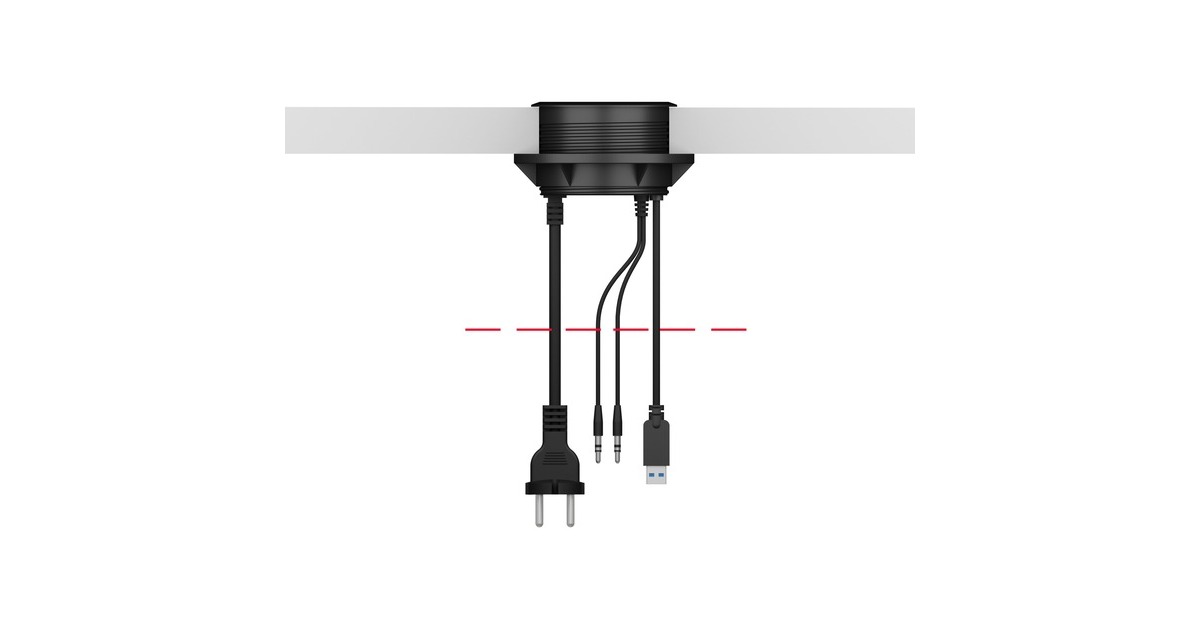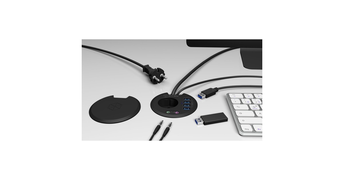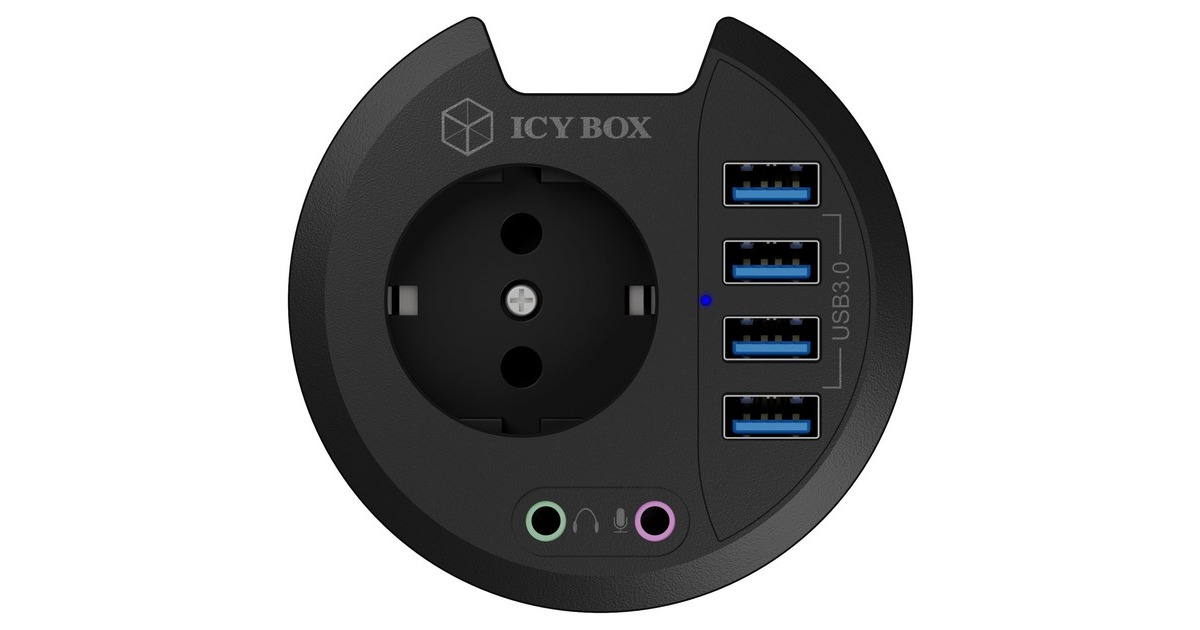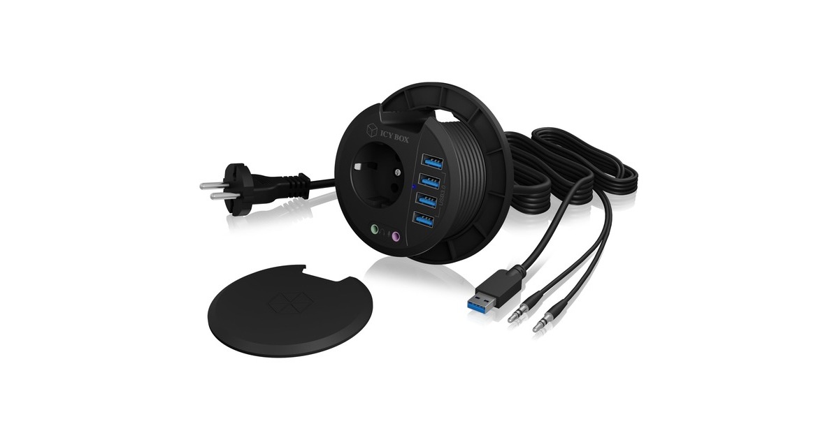 Der IB-HUB1430 ist die elegante Lösung für einen aufgeräumten Schreibtisch. Er lässt sich werkzeuglos in vorhandene Tischbohrungen (80 mm) einfügen und bietet genügend Platz, um mehrere Kabel durchzuführen. Der USB 3.2 Gen 1 Type-A Hub sorgt für Transferraten von bis zu 5 Gbit/s. Eine EU Steckdose mit 230 V kann eine beliebiges Gerät mit Strom versorgen. Desweiteren kann an die beiden 3,5 Klinkenanschlüsse ein Kopfhörer oder Headset angeschlossen werden.
