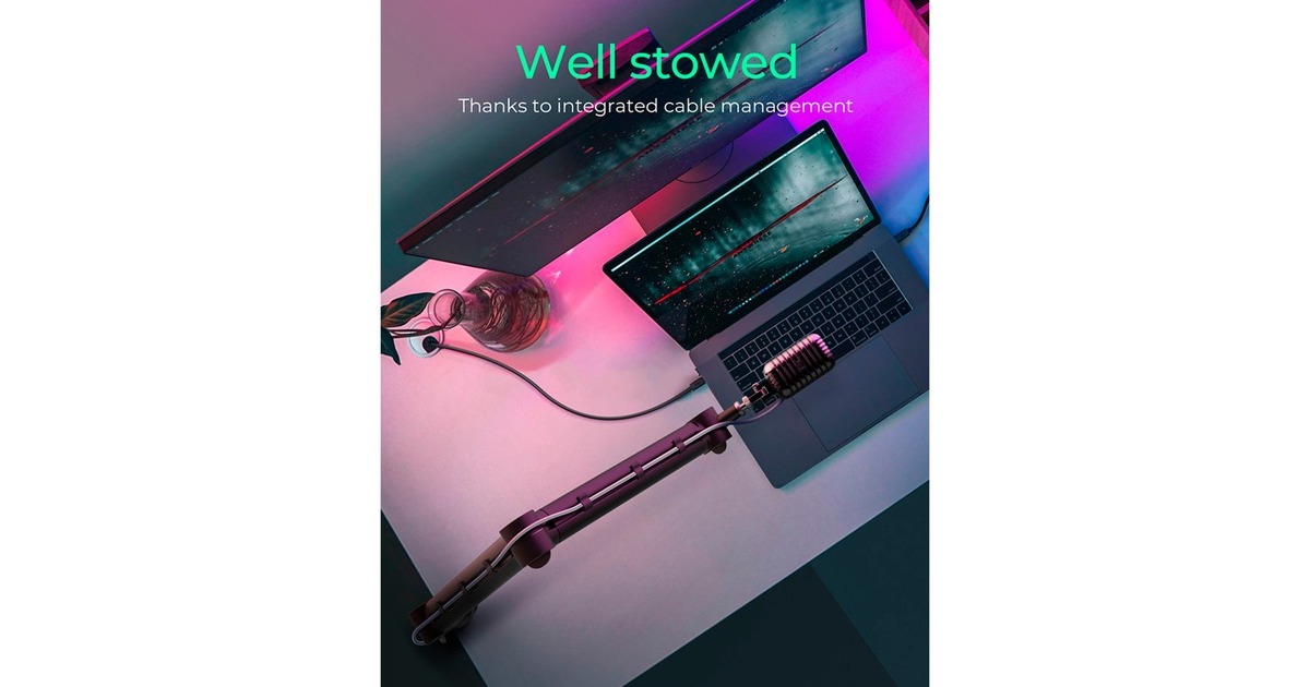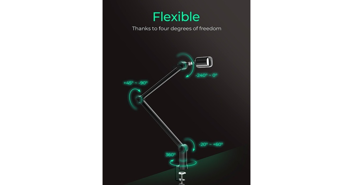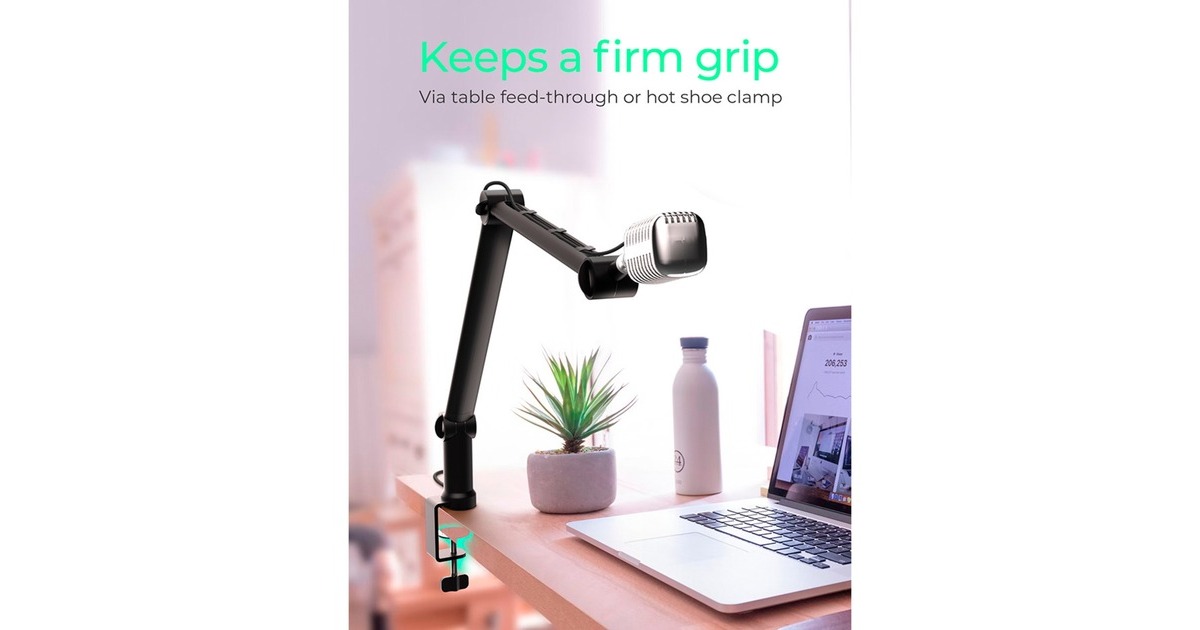 Dank der 360° drehbaren Ausleger ist eine flexible und wunschgerechte Mikrofonpositionierung so einfach wie nie. Der klappbare Scherenarm dient einer kompakten Lagerung sowie einem einfachen Transport. Der Mikrofonständer kann entweder mittels robuster Schraubbefestigung bei einer Tischdurchführung oder mittels flexiblem Klemmfuß sicher befestigt werden. Die doppelten Aufhängungsfedern in jedem Armsegment helfen dabei, dass Mikrofon zusätzlich vor Vibrationen und Erschütterungen zu schützen und damit störende Geräusche zu unterdrücken.Art.-Nr.: 1894899