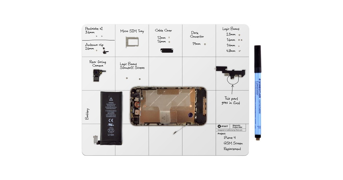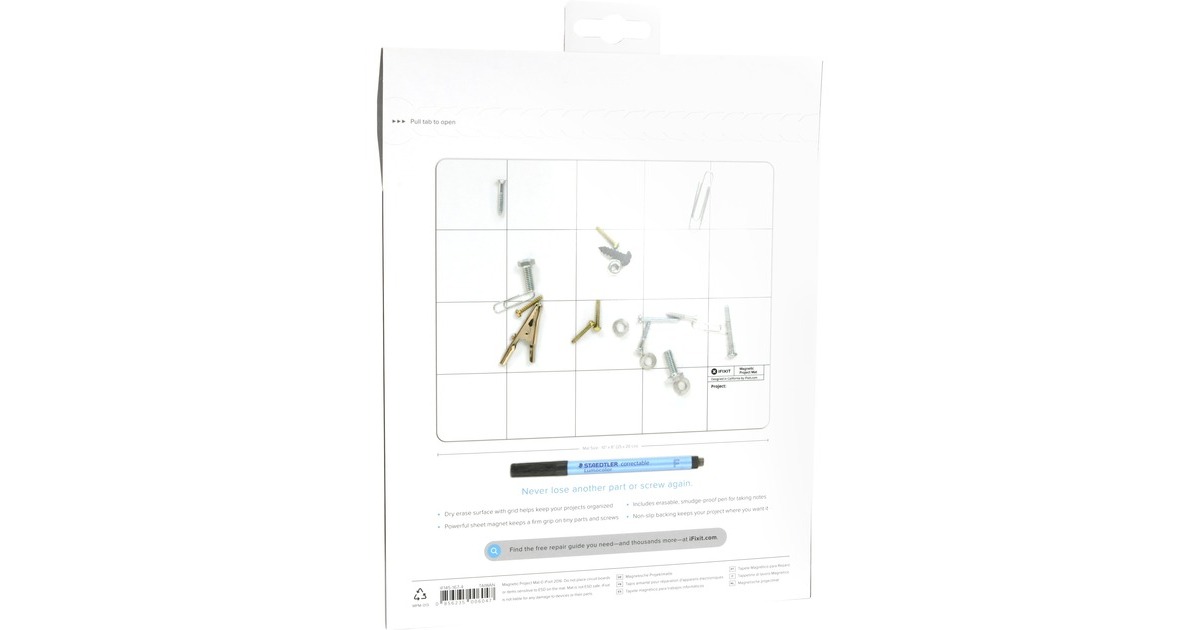 Die Arbeitsunterlage Magnetic Project Mat Pro von iFixit macht das Leben leichter. Während der Reparatur kann man alle Kleinteile sicher und übersichtlich aufbewahren. Auf der abwischbaren Oberfläche kann man Notizen machen und so Fehler vermeiden. Der Zeitaufwand für den Wiederzusammenbau wird um bis zu 40% reduziert. Diese Arbeitsunterlage ist ca. 20 x 25cm groß und hilft dabei, so einige Probleme, die bei der Reparatur auftreten können, von vorn herein zu vermeiden. Die breite Matte bietet genug Platz für jede Schraube und hält sie sicher fest, nachdem man sie aus dem Gerät herausgeschraubt hat. Ein ideales Hilfsmittel, wenn man sein Handy reparieren will. Nie wieder nach der richtigen Schraube suchen! Man kann sich voll auf die Reparatur konzentrieren, denn die Schrauben bleiben da, wo sie hingelegt wurden. Bei Laptops mit Hunderten von Schrauben empfehlen wir, die ganze Matte als Schraubenlager zu nutzen und sich genaue Notizen zu machen, um die Übersicht nicht zu verlieren. Der mitgelieferte Stift ist für diese Arbeitsunterlage maßgeschneidert. Im Gegensatz zu den gängigen trocken abwaschbaren Universalstiften ist der Lumocolor Stift schmier- und wischfest. Mit dem an dem am Stift angebrachten Radiergummi oder mit einem trockenen Tuch lässt sich die Tinte restlos und schnell wieder entfernen.Art.-Nr.: 1436499