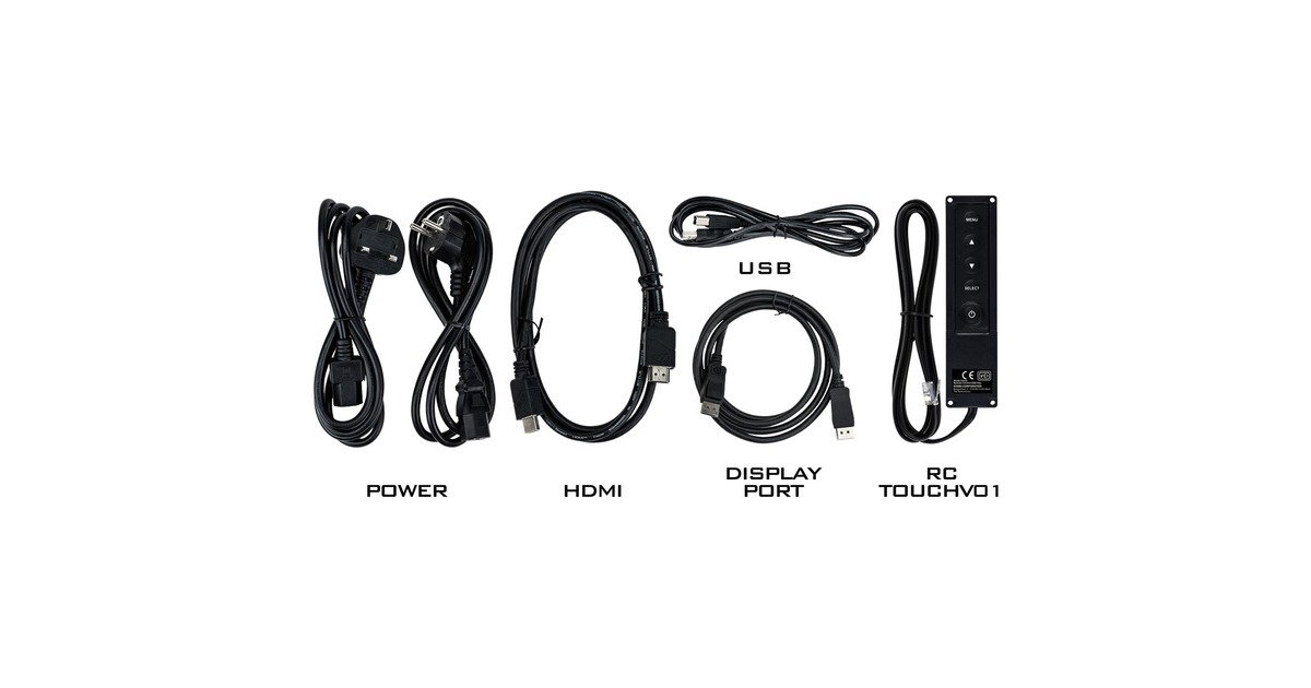 Netzkabel, USB Kabel, HDMI Kabel, DisplayPort Kabel, Leitfaden zur Inbetriebnahme, Sicherheits-Hinweise, Netzteil, Touch Panel Driver Disk (CD-ROM), Externe Bedienleiste |