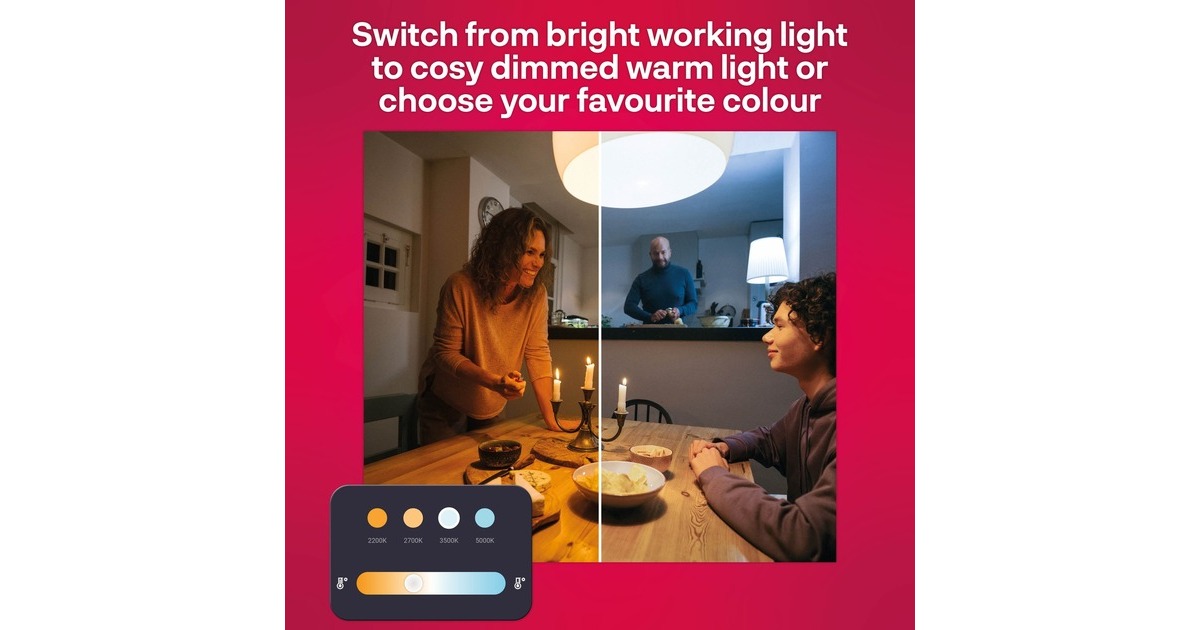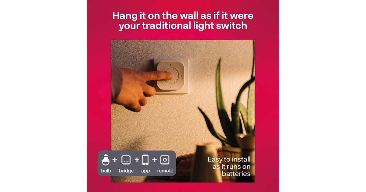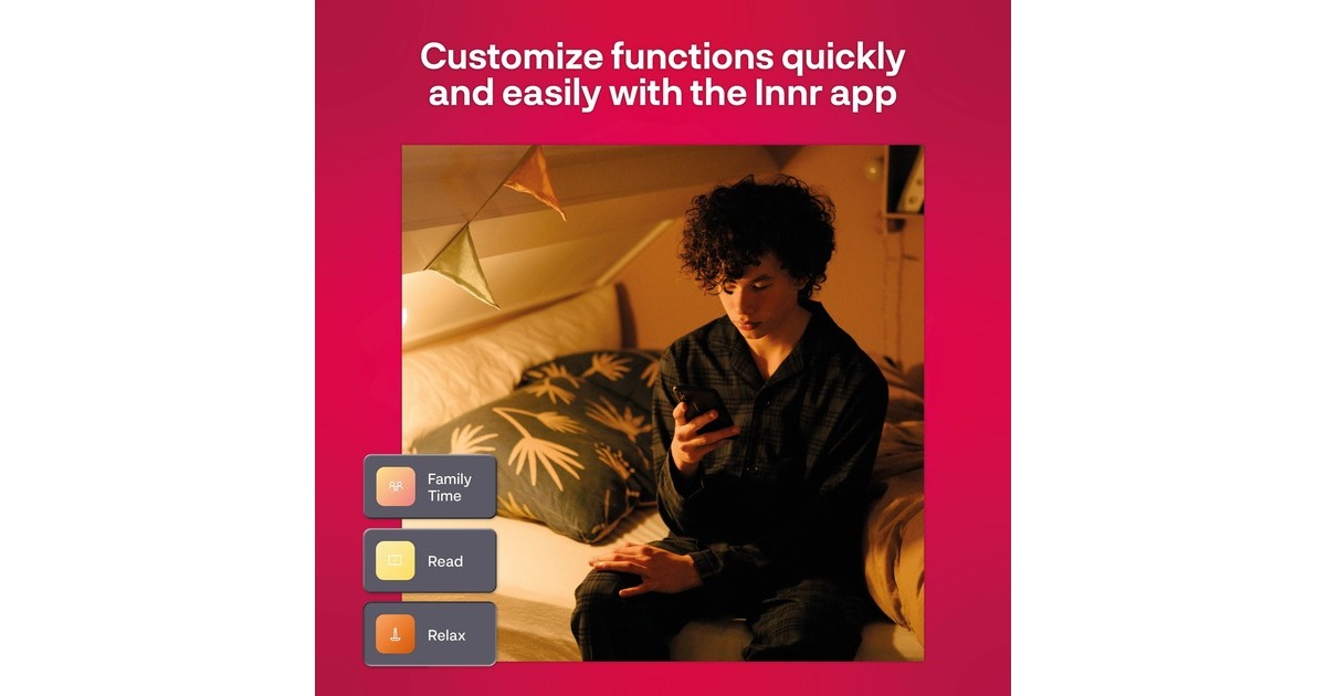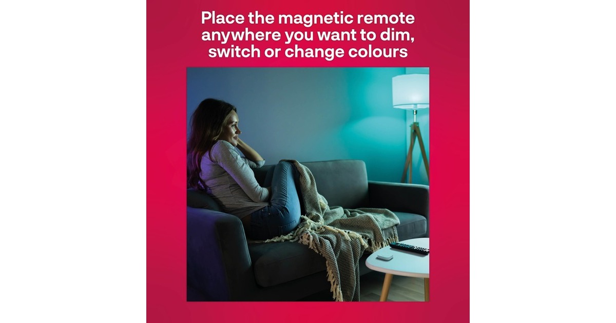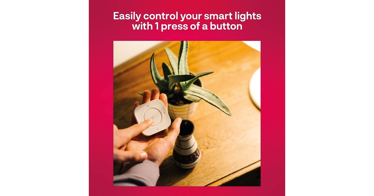 Mit der 5-Tasten-Fernbedienung wählt man, welche Lampen man steuern möchte - alle Leuchten in einem Raum oder eine ausgewählte Gruppe. Mit einem Tastendruck schalten sich die Lichter ein, aus, können abgedimmt oder aufgehellt werden oder zeigen eine bestimmte Lieblingsfarbe. In Kombination mit der Innr App kann man eigene Routinen voreinstellen und mit der 5-Tasten-Fernbedienung auswählen.Art.-Nr.: 1848173