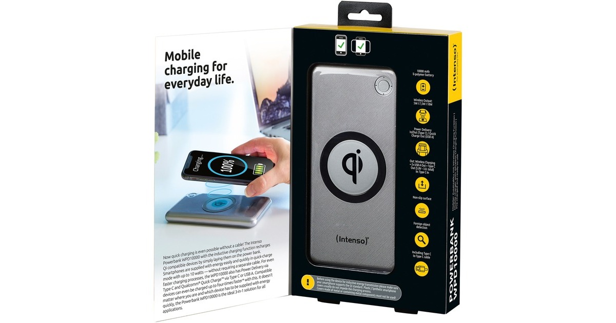 Ausgestattet mit Power Delivery, Quick Charge 3.0 Funktion und induktivem Ladepad sorgt die Wireless Powerbank WPD10000 von Intenso für schnelles Aufladen mobiler Geräte, immer und überall. Mit der induktiven Ladefunktion lädt die Powerbank WPD10000 Qi-fähige Geräte durch einfaches Auflegen wieder auf. Im Schnelllademodus mit bis zu 10 Watt werden Smartphones so ganz einfach und schnell wieder mit Energie versorgt, ohne ein extra Kabel zu benötigen. Für noch schnellere Ladevorgänge mit bis zu 18 Watt verfügt die WPD10000 darüber hinaus noch über die Schnell-Ladefunktionen Power Delivery (USB-C Anschluss) und Quick Charge 3.0 (USB-A Anschluss). Kompatible Geräte können darüber sogar bis zu vier Mal schneller aufgeladen werden. USB-C und USB-A ermöglichen erstklassige Kompatibilität zu allen aktuellen Smartphones, Tablets und Laptops. Die Wireless Powerbank WPD10000 ist mit einem Überhitzungs- und Überspannungsschutz ausgestattet. Außerdem erkennt das Gerät, ob es sich bei dem aufgelegten Objekt um ein Smartphone oder einen anderen Gegenstand handelt. An jegliche "Fremdkörper" wird keine Energie übertragen, sodass auch hier ein sicherer Betrieb gewährleistet ist. Smartphone Hüllen mit bis zu 5mm Dicke müssen vor dem Ladevorgang nicht entfernt werden, da sie das Laden nicht beeinträchtigen. Dank rutschfester Gummierung auf der Oberfläche hat das Smartphone auf der Powerbank einen sicheren Halt. Eine weiße LED zeigt den aktiven Lademodus an, wenn ein Smartphone aufliegt. Das im Lieferumfang enthaltene USB-C Kabel kann direkt zum schnellstmöglichen Aufladen über Power Delivery oder Quick Charge verwendet werden.Art.-Nr.: 100046505