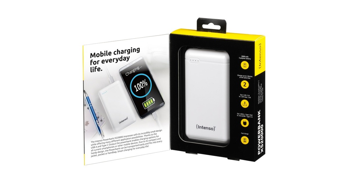 Intensos XS20000 ist eine äußerst kompakte Powerbank mit 20.000 mAh Gesamtkapazität, die jederzeit und gerade unterwegs Smartphones, Tablets und Co. mit Strom versorgt. Die XS20000 besitzt einen USB-A + USB-C Ausgang und wird selbst über MicroUSB oder USB-C aufgeladen. Über eine dedizierte Taste kann man schnell die Restkapazität einsehen.Art.-Nr.: 1641722