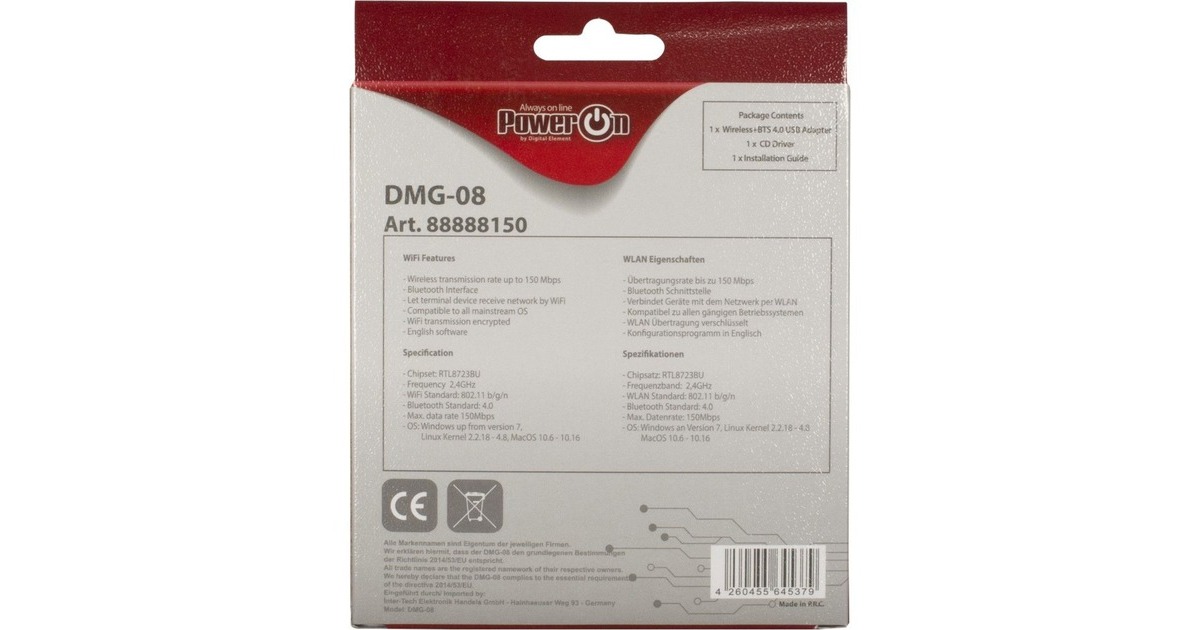 Der DMG-08 ist ein 2in1 WLAN & Bluetooth 4.0 Adapter. Damit können Sie Ihr Notebook oder Ihren PC zu Hause oder im Büro mit dem WLAN-Netzwerk verbinden. Der WLAN (802.11 a/b/g/n (WiFi 4)) USB 2.0 Adapter ist bestens geeignet um im 2,4GHz Netz mit einer Geschwindigkeit von bis zu 150Mbps auf das Internet zuzugreifen. Neben der WLAN-Funktion bietet der DMG-08 auch eine Bluetooth 4.0-Schnittstelle und ermöglicht Ihnen die Verbindung Ihres Computers mit einem Smartphone, Tablet oder anderen Bluetooth-Gerät.Art.-Nr.: 1801851