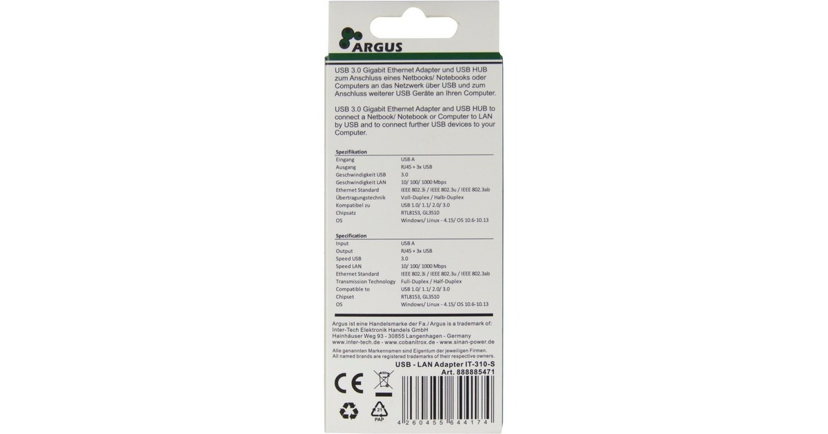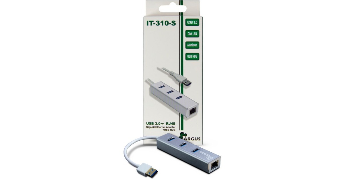 Der ARGUS IT-310-S LAN-Adapter schafft eine Verbindung zwischen Ihrem Netzwerk und einer freien USB 3.0-Schnittstelle Ihres Notebooks/Computers. Neben dem sofort einsatzbereiten RJ45-Netzwerkanschluss bietet der IT-310-S zudem noch einen dreifach USB 3.0 USB-Hub. Das Gehäuse besteht aus Aluminium und setzt mit seiner silbernen Lackierung und polierten Kanten auch optische Akzente.Art.-Nr.: 1880030