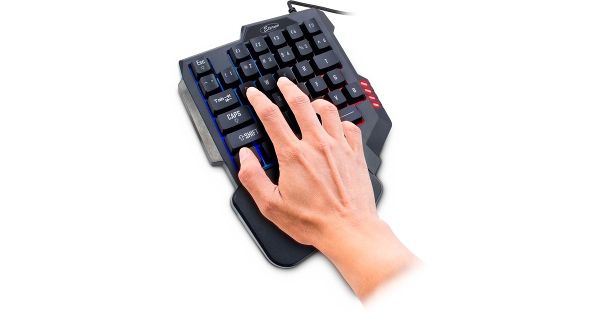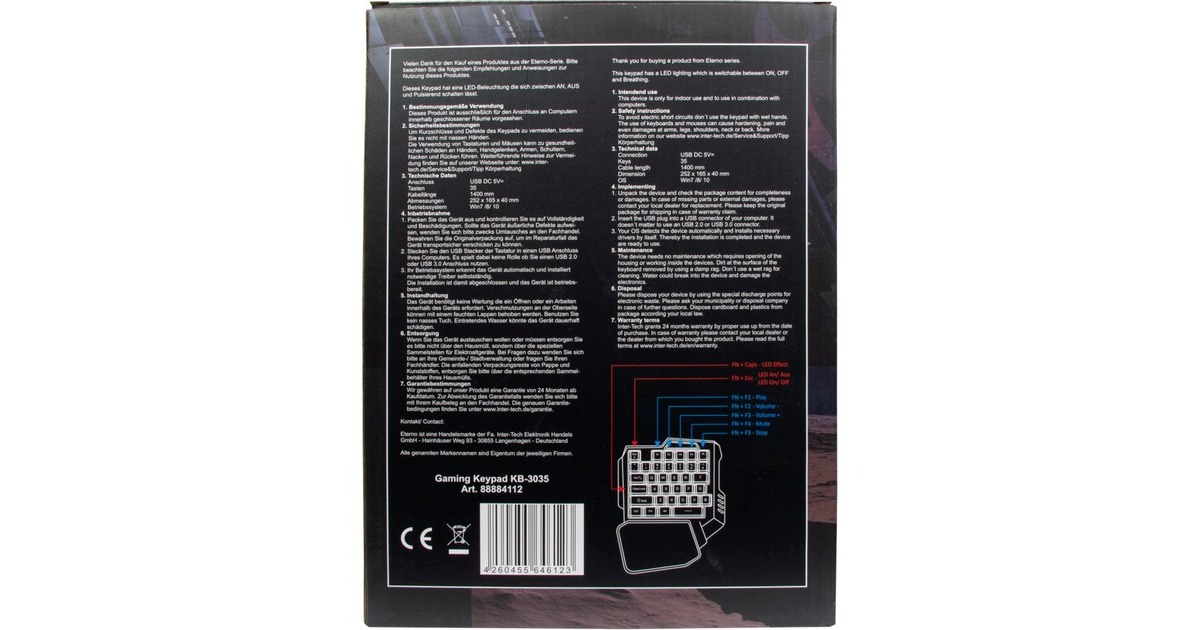 Mit dem KB-3035 RGB Gaming-Keypad von Inter-Tech verschafft sich auch einfachste wesie Vorteile im Spiel. Reduziert auf die 35 wichtigsten Tasten, gehören ungewollte Tastenbefehle der Vergangenheit an. Das ergonomische Design sowie die integrierte Handballenauflage beugen schmerzhaften Entzündungen vor und bieten so ein längeres Spieleerlebnis. Die integrierte RGB-Hintergrundbeleuchtung der Tasten lässt sich per Tastendruck in drei Modi schalten (ON, OFF, PULSIEREND) und wirkt dabei nicht störend, sodass nächtlichen Spielesessions nichts im Wege steht. Mit der FN-Taste lassen sich zudem, in Kombination mit den F-Tasten, fünf Multimediabefehle ausführen.Art.-Nr.: 1696008