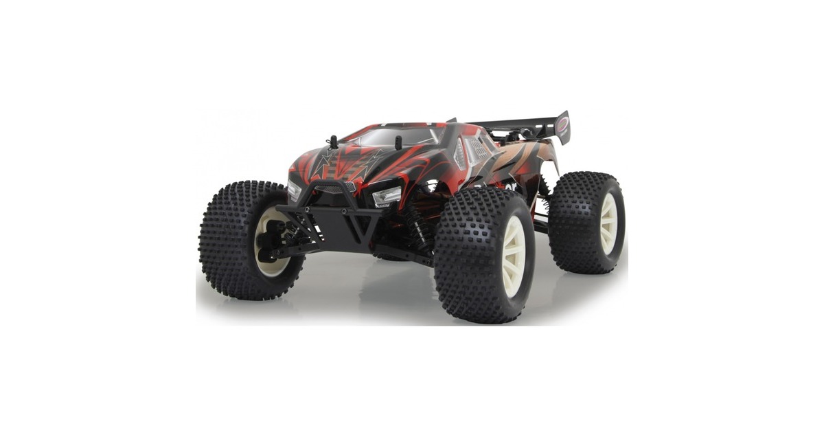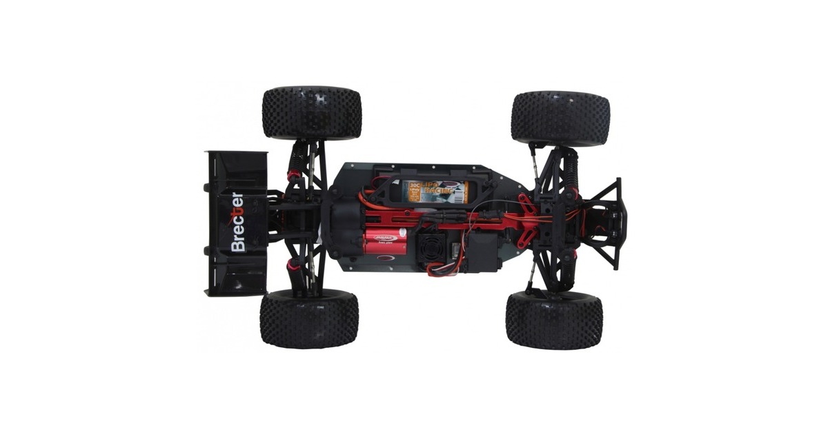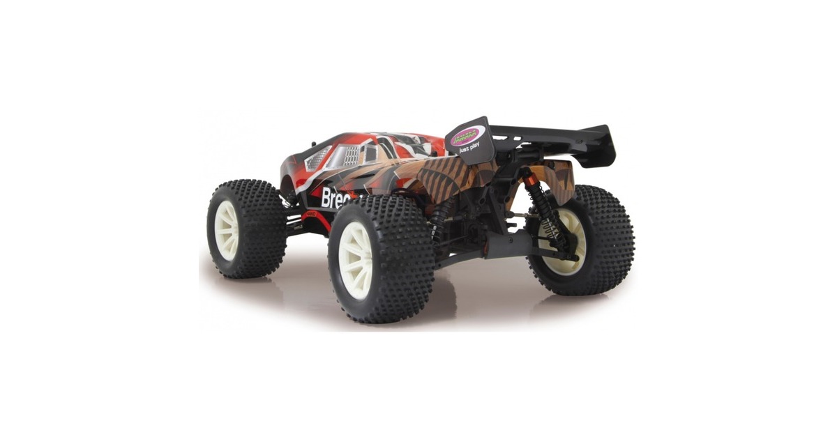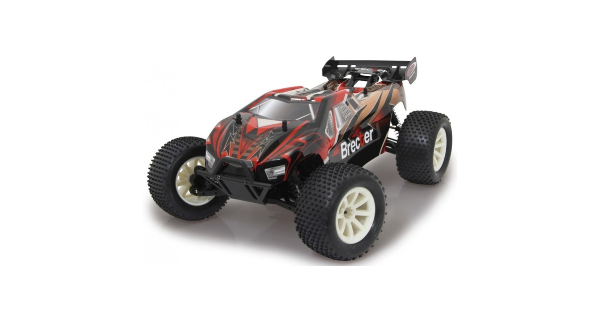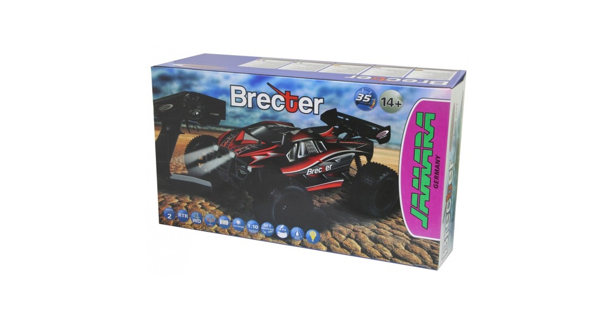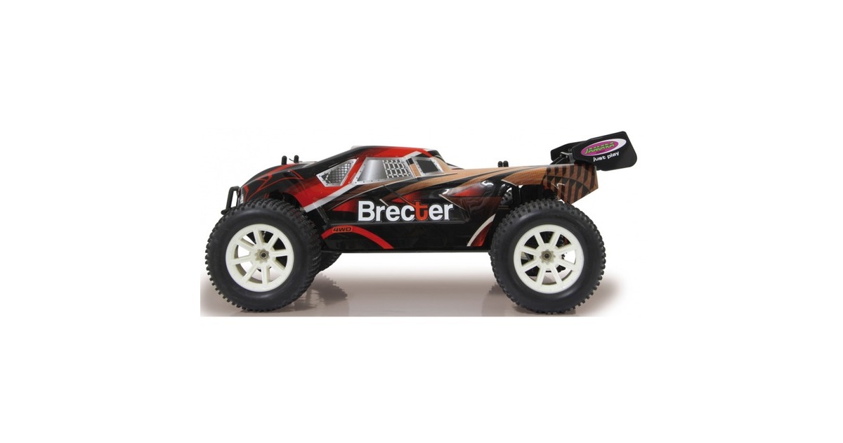 Der Jamara Brecter EP Lipo Truggy verfügt über einen kräftiger Bürstenmotor mit bis zu 20.000 U/min und einen programmierbaren Speedregler (40 A, gekühlt, programmierbar). Dank Allradantrieb mit Stahldifferentialen vorne und hinten kommt man überall gut voran. Dazu ist das Fahrwerk komplett einstellbar. Die Antriebswellen aus Stahl und die gekapselte Getriebeeinheit stecken auch den täglichen Offroadeinsatz weg. Zur weiteren Ausstattung gehören LED-Scheinwerfer, ein Aluminium-Chassis eloxiert im Titandesign, eine Aluminium-Chassisversteifung (oben), eine Aluminium Querlenkerversteifung zur Stabilisierung, einstellbare Öldruckstoßdämpfer mit Aluminium-Stoßdämpferkappen, ein einstellbarer High Downforce Heckspoiler, kugelgelagerte Radachsen und Antriebskomponenten, eine Pivot-Ball Vorderradaufhängung, schnelles und kräftiges Lenkservo sowie ein doppelt verstärkter Rammschutz.Art.-Nr.: 1537625