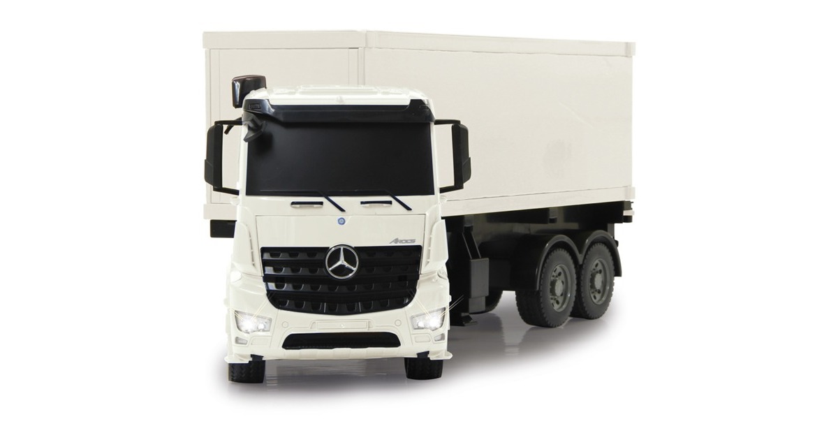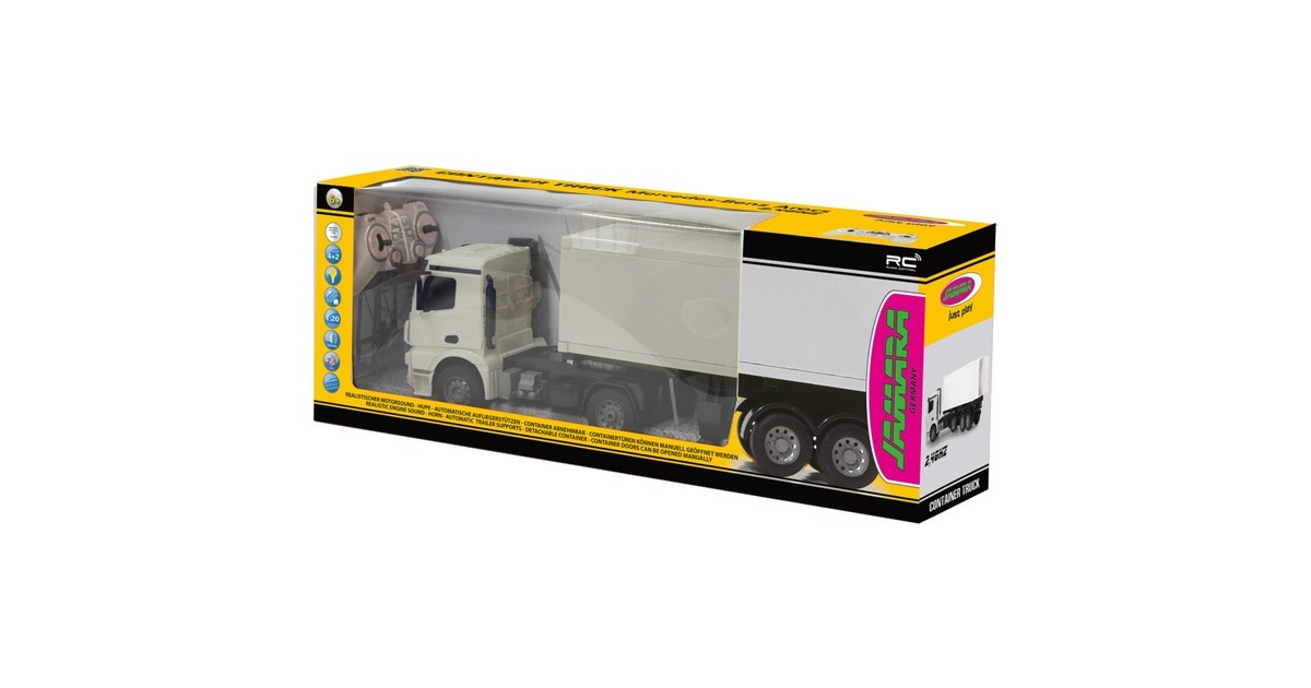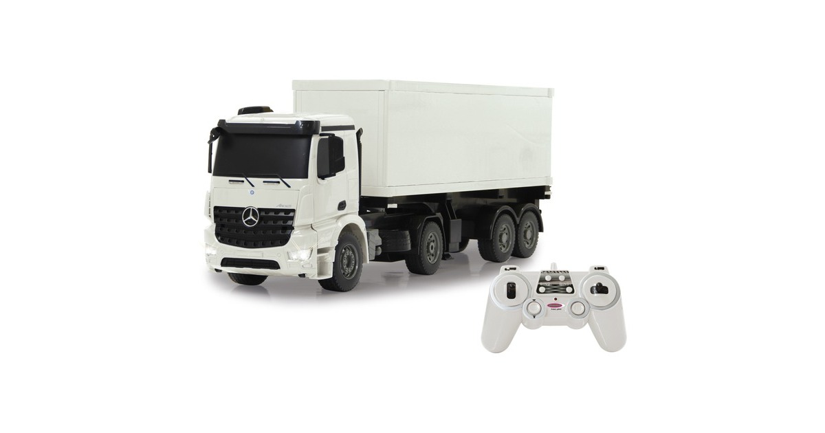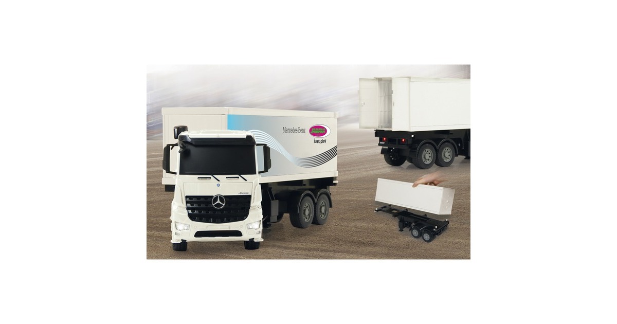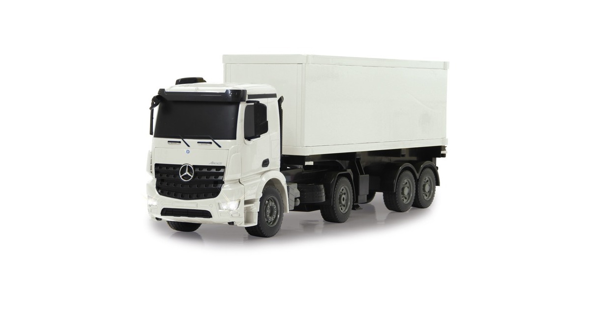 Der Jamara Container LKW Mercedes-Benz Arocs ist ein RC-LKW mit Anhänger im Maßstab 1:20. Er ist sowohl für den Indoor-, als auch den Outdoor-Einsatz geeignet. Er bietet jede Menge Action und Fahrspaß mit realistischem Motorsound. Ein zusätzliches Highlight stellen die automatischen Aufliegerstützen dar. Der Container ist zudem abnehmbar und die Containertüren können auch manuell geöffnet werden. Weiterhin ist der Mercedes Aroccs mit einer LED-Beleuchtung ausgestattet.Art.-Nr.: 1444445