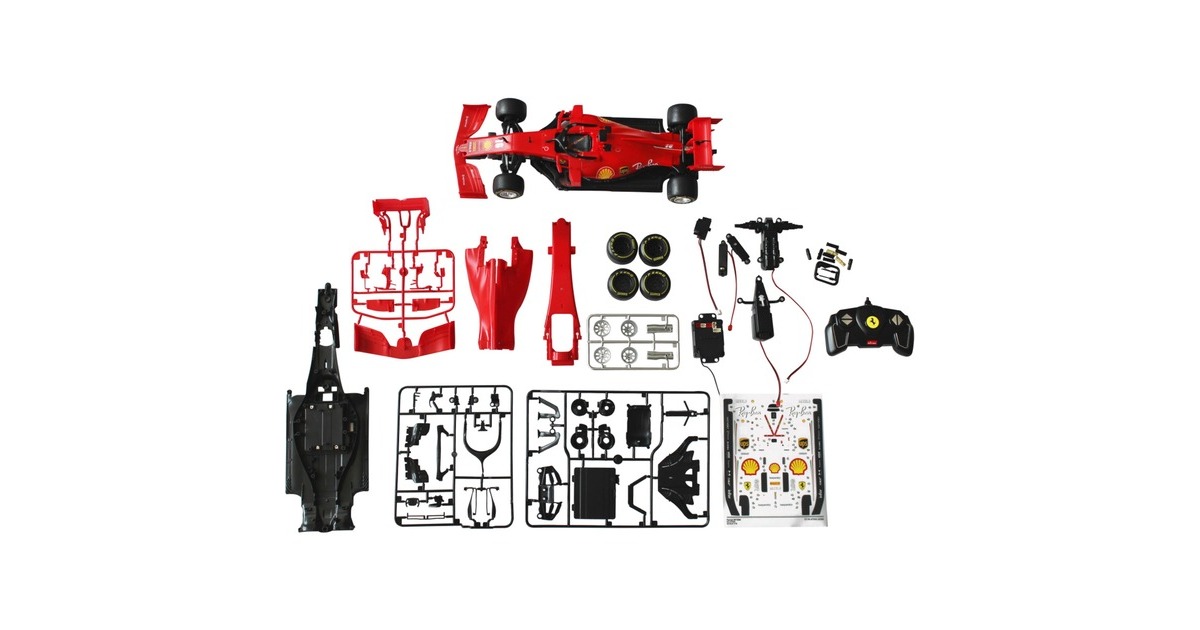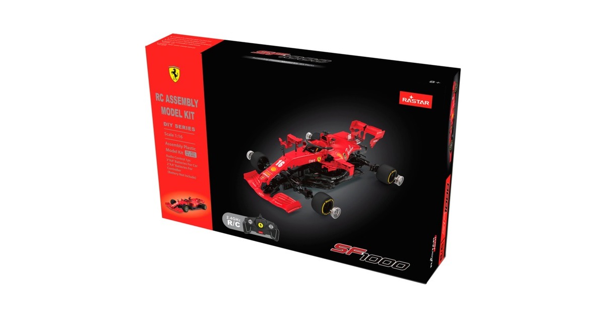 Der Ferrari SF 1000 Bausatz von Jamara ist ein 65-teiliges Set mit dem man sich seinen eigenen RC-Rennwagen mit detailgetreuem Innenraum sowie manuell öffenbaren Türen zusammenbauen kann. Die Bauteile werden durch einfaches Zusammenstecken miteinander verbunden, somit ist kein Werkzeug oder Kleber notwendig. Der Bausatz beinhaltet außerdem einen Dekorbogen zum Aufkleben. Mit der ergonomischen Fernsteuerung hält man, wie in einem echten Rennwagen, die Schaltzentrale in der Hand und erreicht Geschwindigkeiten von bis zu 10 km/h. Leicht zu erlernende Kommandos lassen das Modell genau das tun was man vorgibt. Also, ab zur Stadtrunde auf dem Parkett im Kinderzimmer und dem Spielspaß steht nichts mehr im Wege.Art.-Nr.: 1798442
