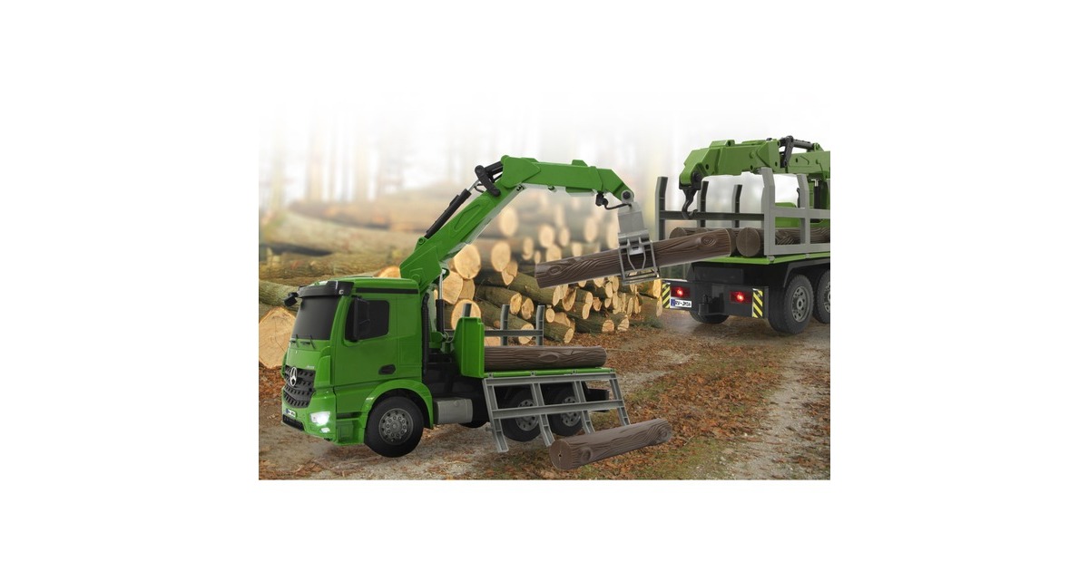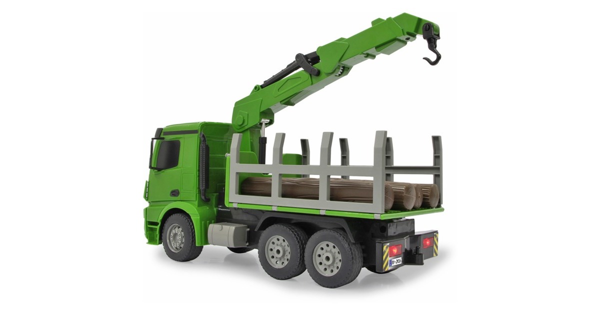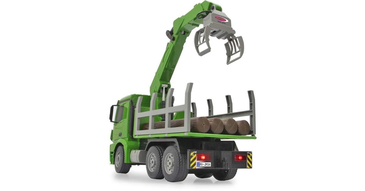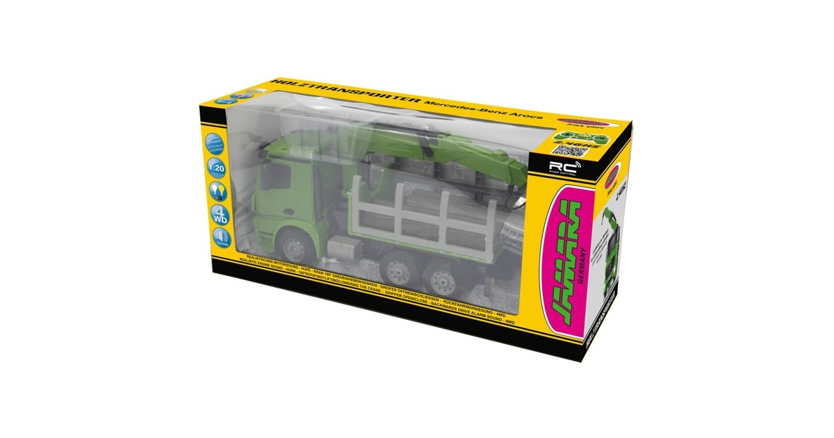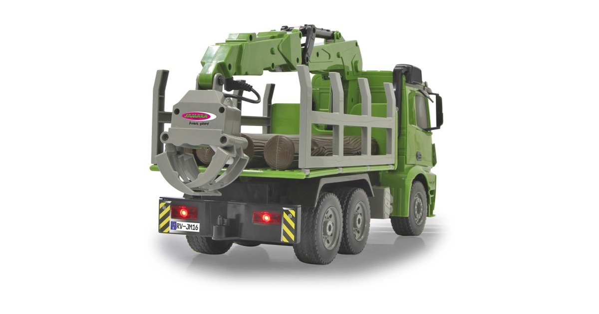 Der Jamara Holztransporter Mercedes Benz Arocs ist ein RC-LKW mit drehbarem Kran im Maßstab 1:20. Er ist sowohl für den Indoor-, als auch den Outdoor-Einsatz geeignet. Er bietet jede Menge Action und Fahrspaß mit realistischem Motorsound. Ein Highlight stellt der um 180° drehbare Kran dar. Er lässt sich im und gegen den Uhrzeigersinn drehen. Der an ihm wahlweise befestigte Lasthaken oder Greifarm lässt sich mithilfe der Fernsteuerung heben und senken. Die Bordwände sind zudem manuell aufklappbar. Weiterhin ist der Mercedes Arocs mit einer LED-Beleuchtung ausgestattet.Art.-Nr.: 1683626