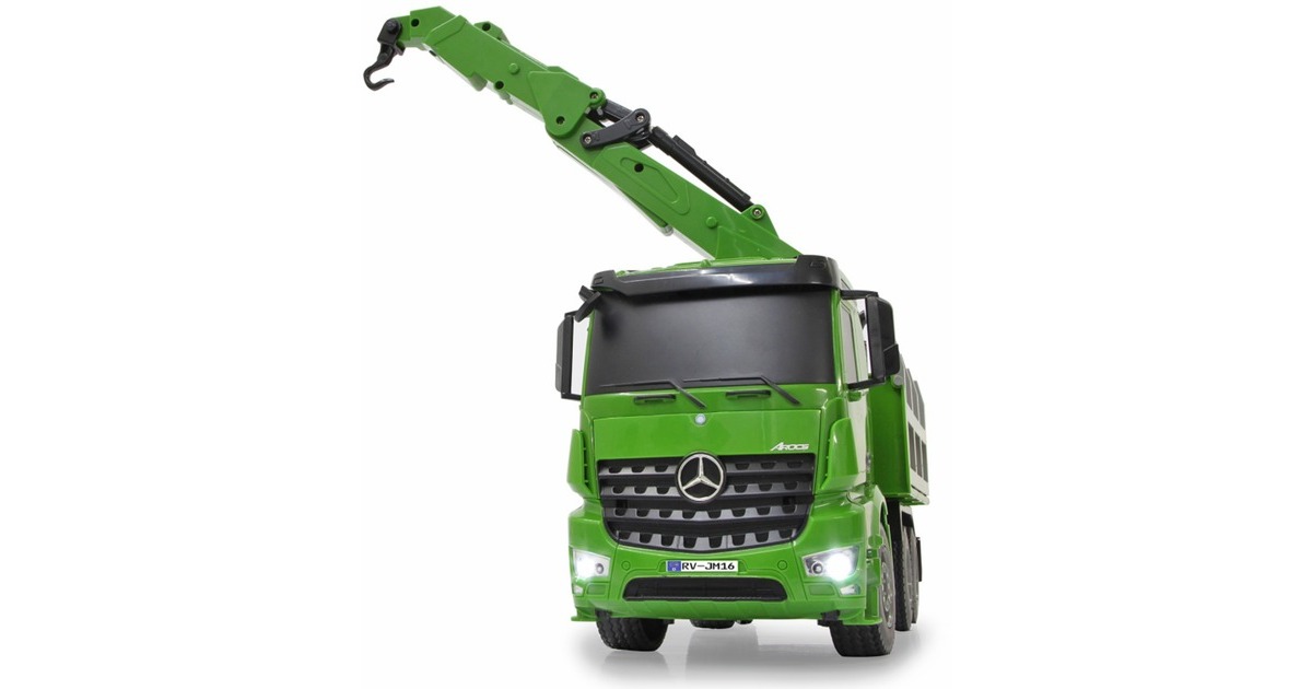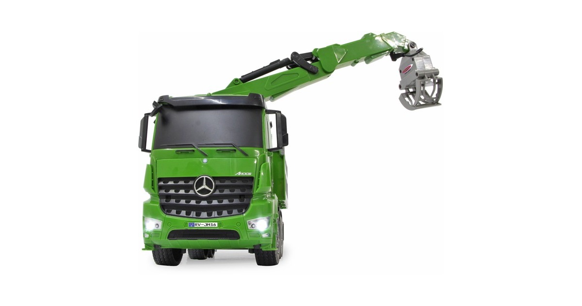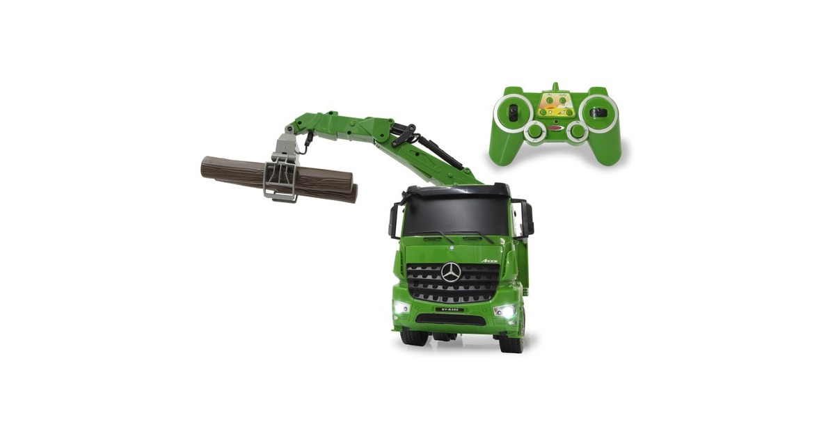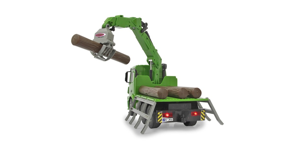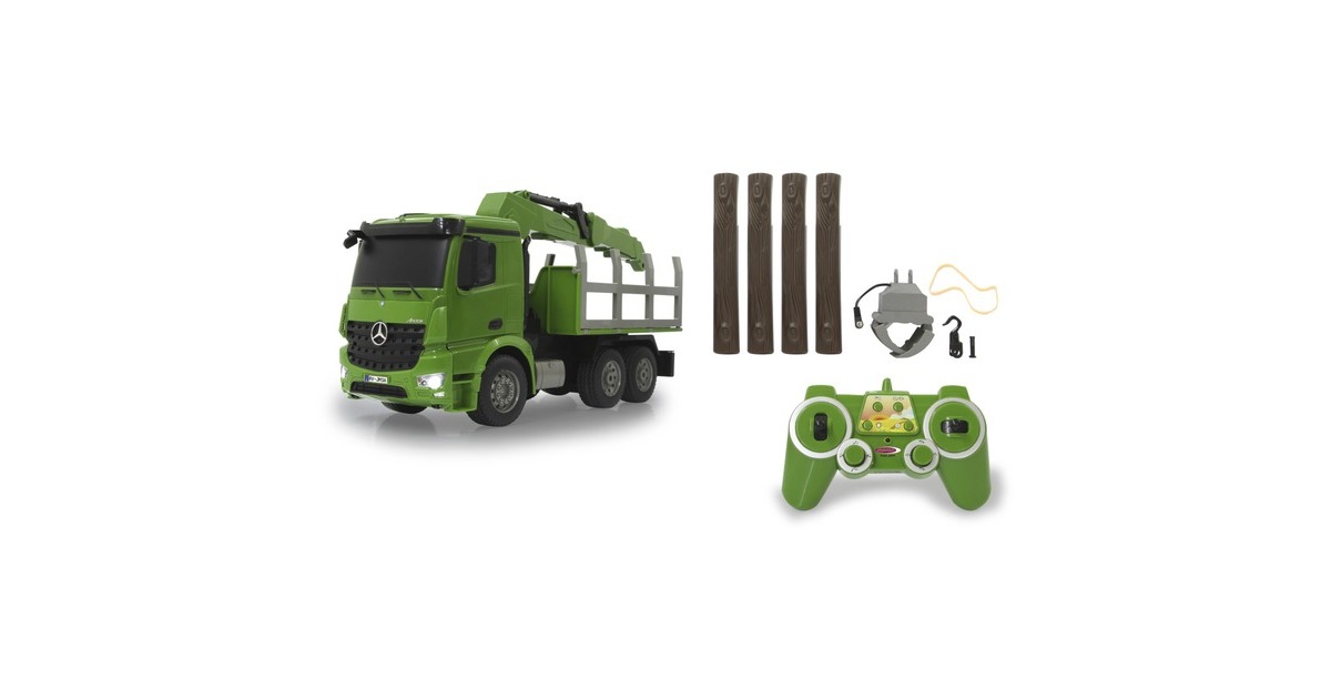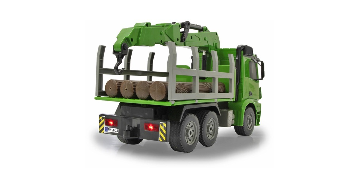Der Jamara Holztransporter Mercedes Benz Arocs ist ein RC-LKW mit drehbarem Kran im Maßstab 1:20. Er ist sowohl für den Indoor-, als auch den Outdoor-Einsatz geeignet. Er bietet jede Menge Action und Fahrspaß mit realistischem Motorsound. Ein Highlight stellt der um 180° drehbare Kran dar. Er lässt sich im und gegen den Uhrzeigersinn drehen. Der an ihm wahlweise befestigte Lasthaken oder Greifarm lässt sich mithilfe der Fernsteuerung heben und senken. Die Bordwände sind zudem manuell aufklappbar. Weiterhin ist der Mercedes Arocs mit einer LED-Beleuchtung ausgestattet.Art.-Nr.: 1683626
