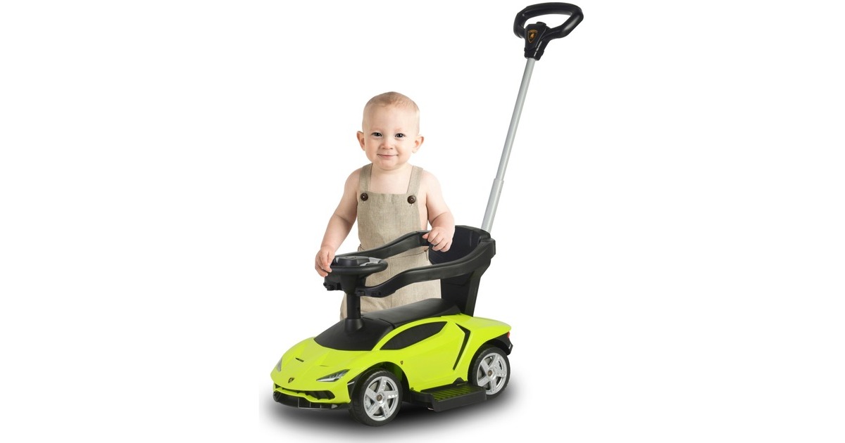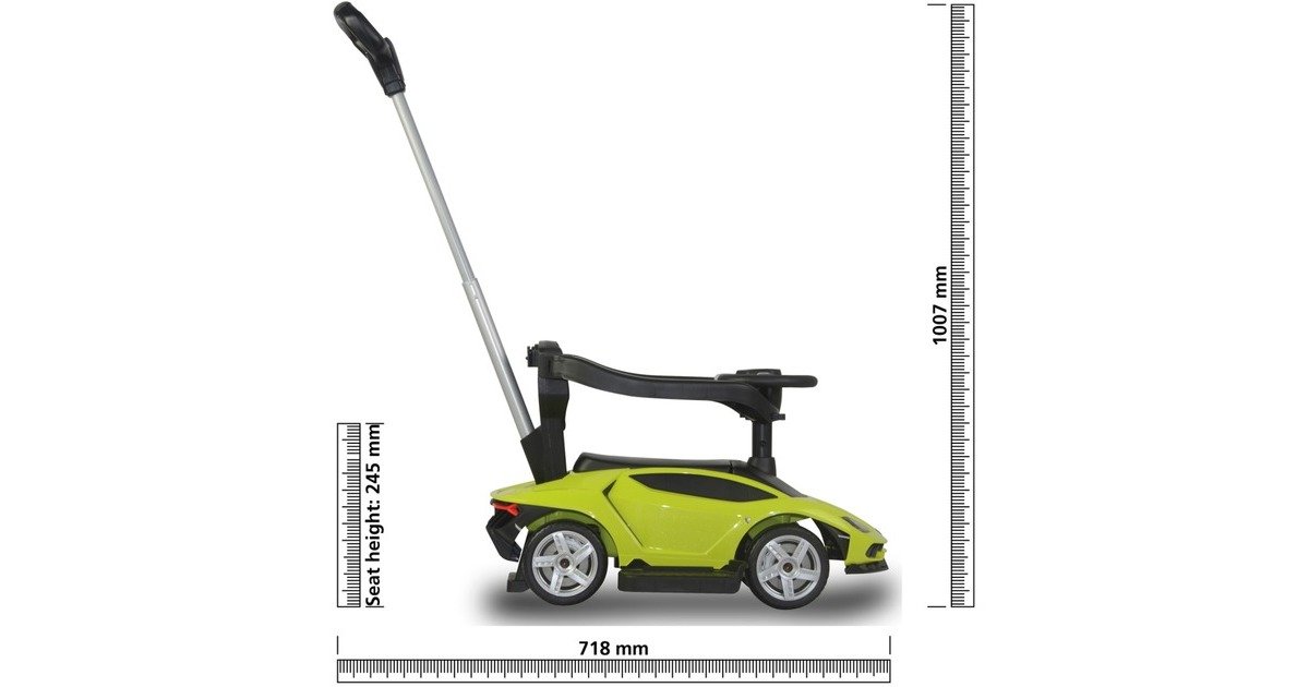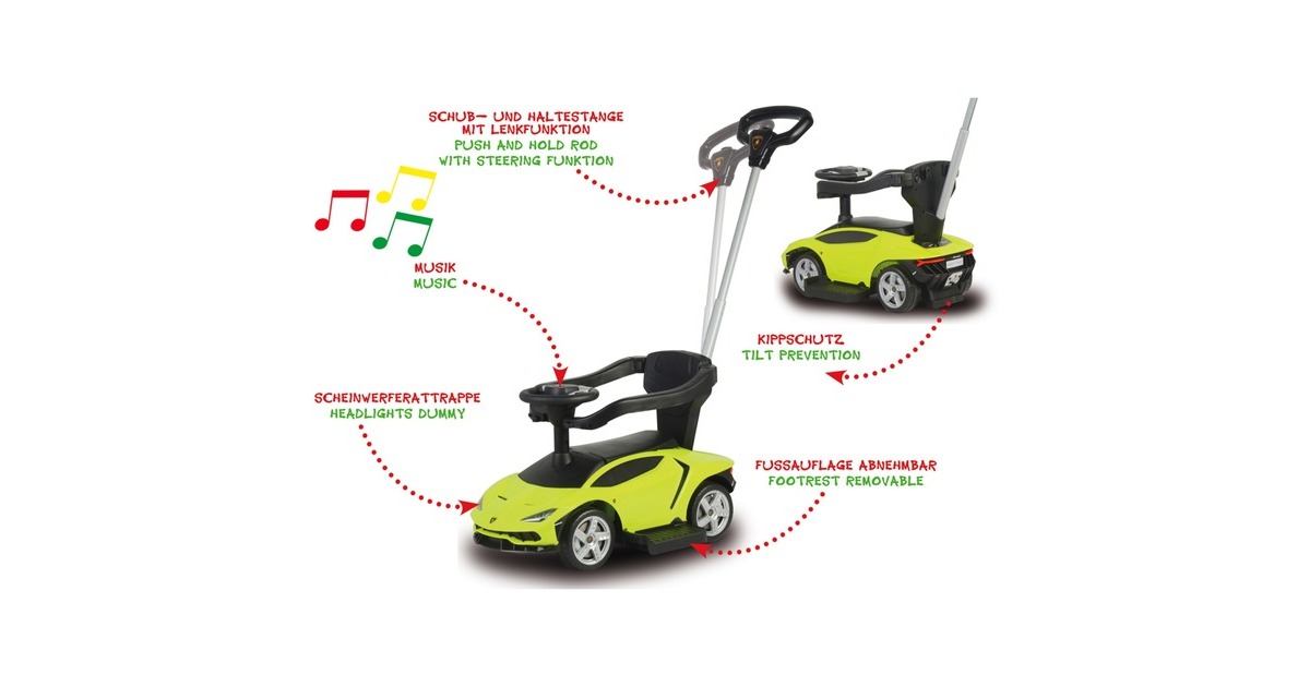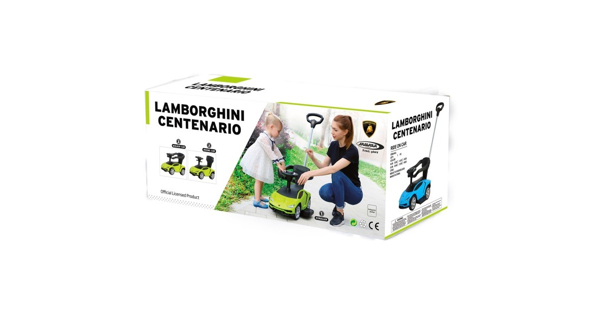 Für die Kleinsten in der Familie hat Jamara das ideale, kindgerechte Fahrzeug. Der orginalgetreue Lamborghini Centenario 3in1 bietet dank der stabilen und liebevoll gestalteten Karosserie ein sicheres Fahrvergnügen. Dafür sorgen die Rückenlehne mit seitlichen Schutzbügel, abnehmbare Fußauflagen und der Kippschutz. Die Schub- und Haltestange ist höhenverstellbar von 75 mm bis 1000 mm und mit der Lenkfunktion können die Kids bequem und sicher geschoben werden. Mit dem griffigen Lenkrad mit Sound, einem Kofferaum unterm Sitz und Scheinwerferattrappen ist der Lamborghini Centenario Rutscher das ideale Fahrzeug für die kleinsten Entdecker, gleichermaßen Indoor wie Outdoor. Art.-Nr.: 1683631