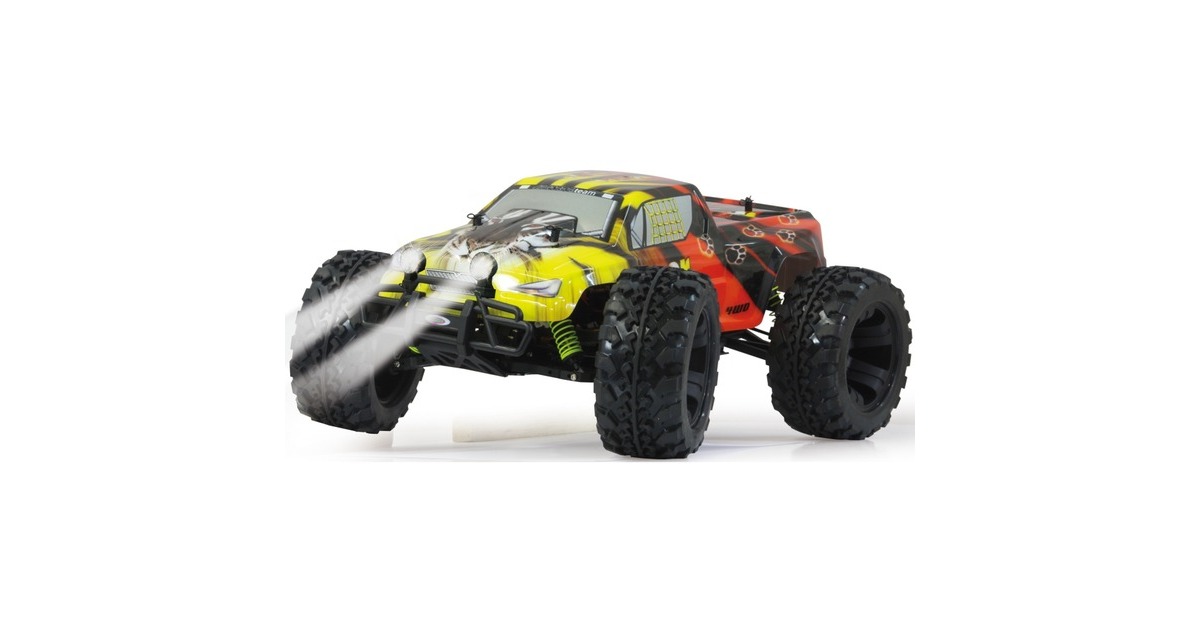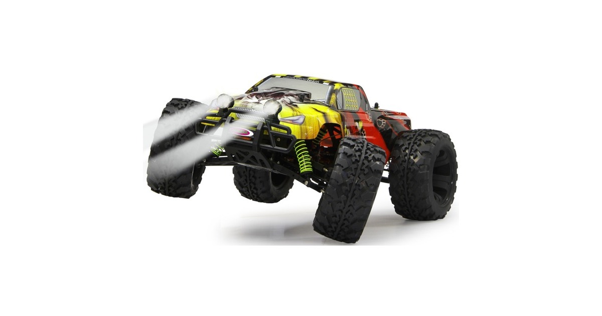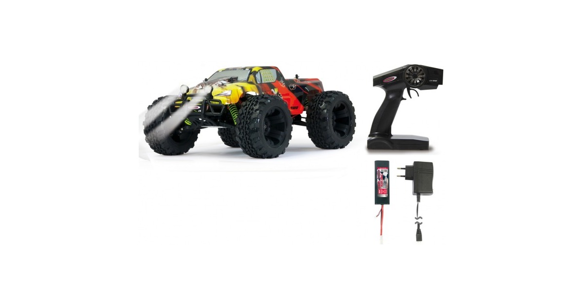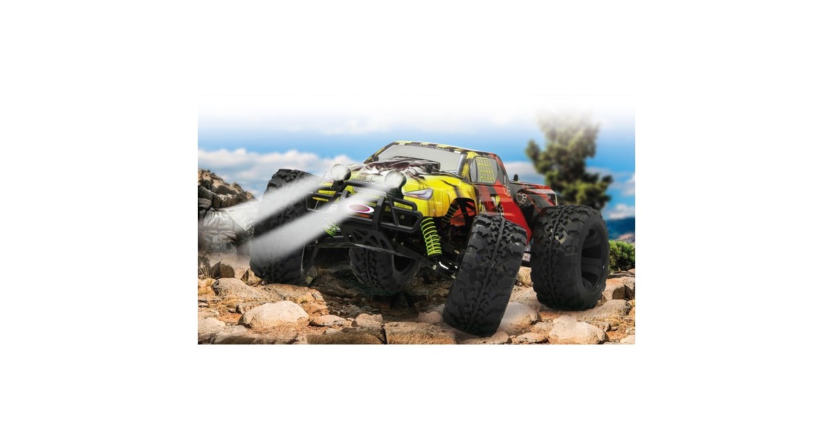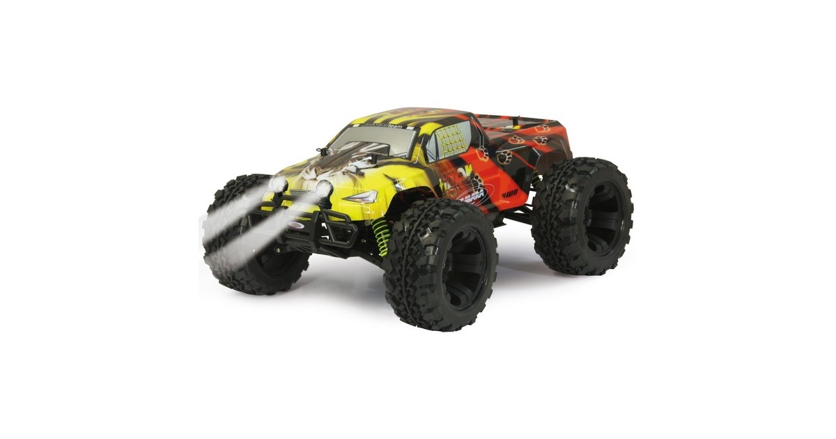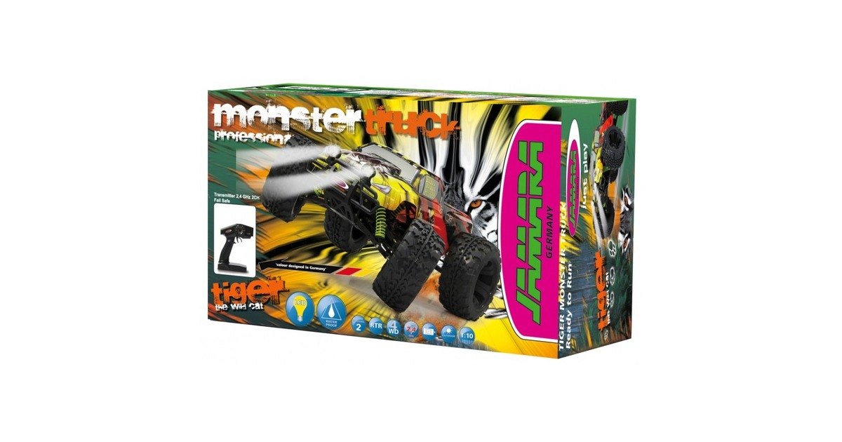 Der Jamara Tiger Lipo Monstertruck verfügt über einen kräftigen Bürstenmotor mit bis zu 20.000 U/min und einen programmierbaren Speedregler (40 A, gekühlt, programmierbar). Dank Allradantrieb mit Stahldifferentialen vorne und hinten kommt man überall gut voran. Dazu ist das Fahrwerk komplett einstellbar. Die Antriebswellen aus Stahl und die spritzwassergeschützte Elektronik stecken auch den täglichen Offroadeinsatz weg. Zur weiteren Ausstattung gehören zwei abnehmbare LED-Scheinwerfer, ein Aluminium-Chassis eloxiert im Titandesign, eine Aluminium-Chassisversteifung (oben), einstellbare Öldruckstoßdämpfer mit Aluminium-Stoßdämpferkappen, kugelgelagerte Radachsen und Antriebskomponenten, eine Pivot-Ball Vorderradaufhängung, schnelles und kräftiges Lenkservo sowie ein transparenter Hauptzahnradschutz.Art.-Nr.: 1537633