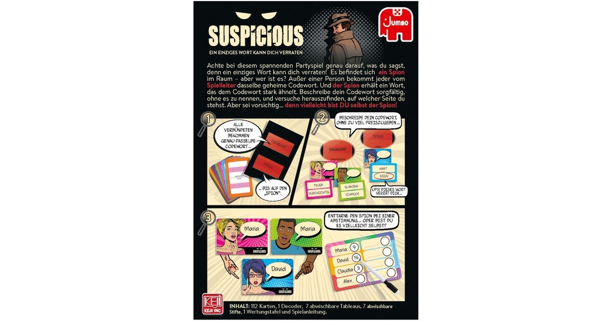 Ein Spion ist unter uns - und jeder ist verdächtig, denn niemand weiß, wer es ist. Mit Ausnahme eines Spielers (des Spions) erhalten alle dasselbe geheime Codewort. Mit sorgfältig gewählten Hinweisen beschreibst du dein geheimes Codewort und versuchst herauszufinden, auf welcher Seite du stehst. Doch Vorsicht! Vielleicht bist DU ja der Spion!Art.-Nr.: 1725819