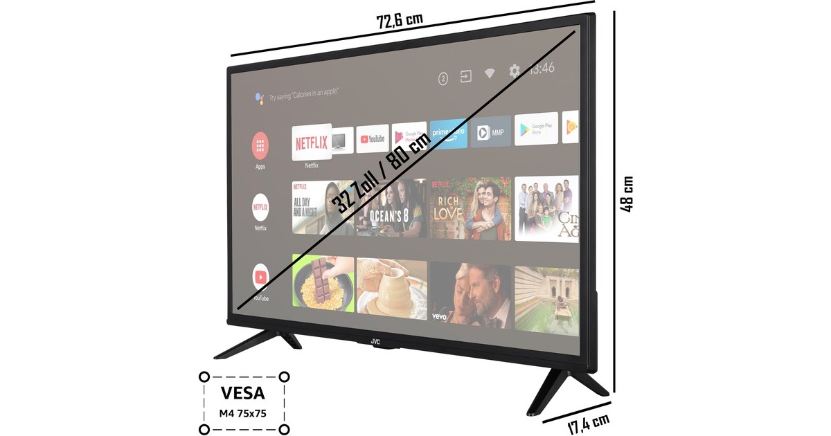 Der JVC LT-32VAH3255 ist ein kompakter AndroidTV mit 80 cm (32") Bilddiagonale und WXGA Auflösung (1.366 x 768 Pixel), der durch zahlreiche Anschlüsse, integrierte Stereo-Lautsprecher und weiteren smarten Funktionen. Über WLAN erhält man Zugriff auf Video/Audio on Demand Angebote, einen Webbrowser, Wetter- oder Nachrichtenapps sowie Smart Home Funktionen mittels Google Assistant. Über Bluetooth lassen sich zudem sämtliche Audio-Inhalte von Smartphones, Tablets und Co. übertragen. Der JVC LT-32VAH3255 besitzt 12 Watt starke Stereo-Lautsprecher und erzeugt so eine mitreißende Atmosphäre in Spielen, Filmen, Serien und bei Musik. Als Anschlüsse stehen HDMI, VGA, USB sowie ein RJ-45 Port bereit, sodass der Fernseher auch als Monitor genutzt werden kann. Zum Fernsehen ist der LT-32VAH3255 mit einem Triple Tuner für Kabel, Satellit und terrestrische Antenne ausgestattet.Art.-Nr.: 1898641