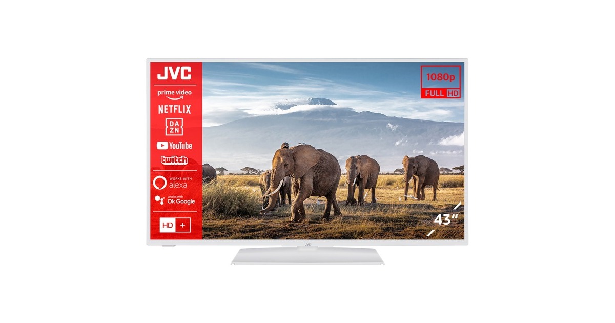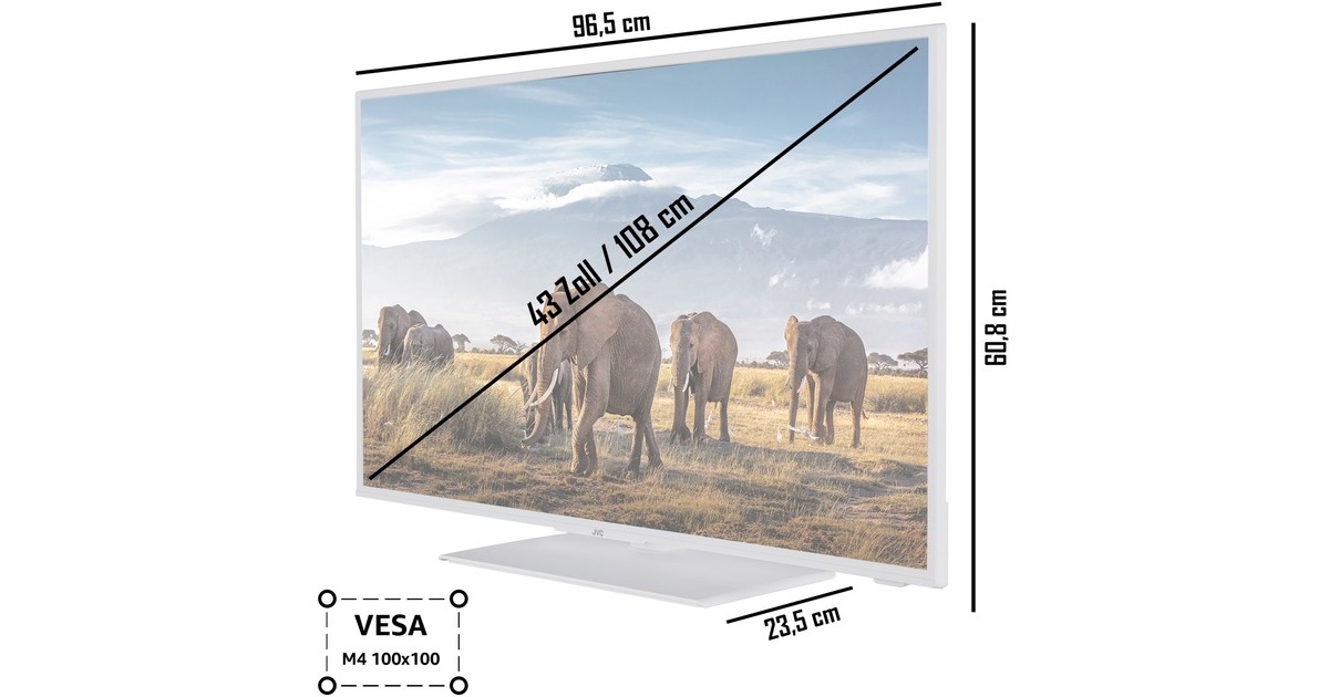 Der JVC LT-43VF5155W ist ein kompakter SmartTV mit 108 cm (43") Bilddiagonale und FullHD Auflösung (1.920 x 1.080 Pixel), der durch zahlreiche Anschlüsse, integrierte Stereo-Lautsprecher und weiteren smarten Funktionen. Über WLAN erhält man Zugriff auf Video/Audio on Demand Angebote, einen Webbrowser, Wetter- oder Nachrichtenapps sowie Smart Home Funktionen mittels Alexa oder den Google Assistant. Der JVC LT-43VF5155W besitzt 16 Watt starke Stereo-Lautsprecher und erzeugt so eine authentische Atmosphäre in Spielen, Filmen, Serien und bei Musik. Als Anschlüsse stehen HDMI, VGA, USB sowie ein RJ-45 Port bereit, sodass der Fernseher auch als Monitor genutzt werden kann. Zum Fernsehen ist der LT-43VF5155W mit einem Triple Tuner für Kabel, Satellit und terrestrische Antenne ausgestattet.Art.-Nr.: 1898625