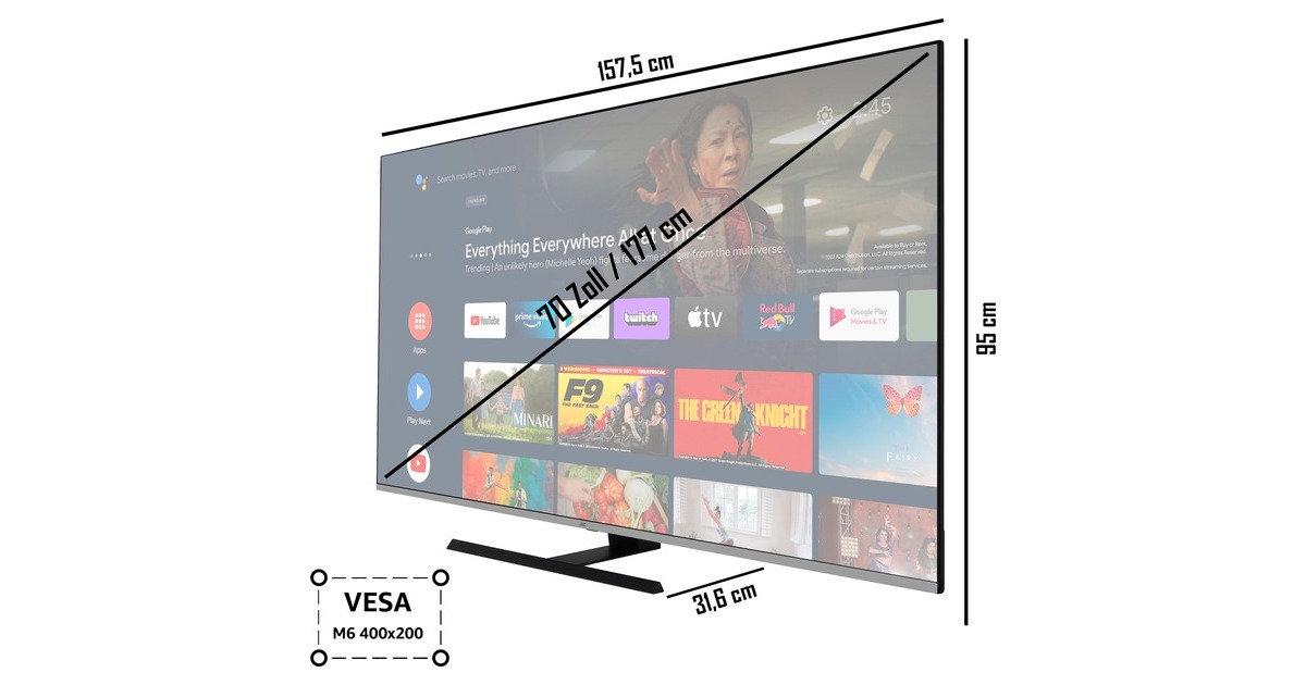 Ausgestattet mit einem 177 cm (70") großes Panel liefert der LT-70VAQ7255 eine beeindruckend große Kulisse für jeden Inhalt. Dank der hohen UltraHD Auflösung (3.840 x 2.160 Pixel) werden Inhalte dabei außerdem besonders scharf dargestellt und sehen großartig aus. Der LT-70VAQ7255 unterstützt die HDR-Technologie und liefert damit außerordentlich realistische Kontraste, durch welche jede Szene noch authentischer aussieht. Für einen mitreißenden Sound ist der LT-70VAQ7255 mit 24 Watt starken Stereo-Lautsprechern inklusive Dolby Atmos ausgestattet, mit welcher Sound hautnah spürbar wird. Als SmartTV mit WLAN (alternativ auch per Ethernet Kabel) ermöglicht der LT-70VAQ7255 Zugriff auf zahlreiche Anwendungen oder Dienste mit denen Fernsehen noch interaktiver und spannender wird. Zum Fernsehen steht ein integrierter Triple Tuner bereit, mit welchem man problemlos sämtliche Signale über Kabel, Satellit oder per terrestrischer Antenne empfangen kann.Art.-Nr.: 1913751