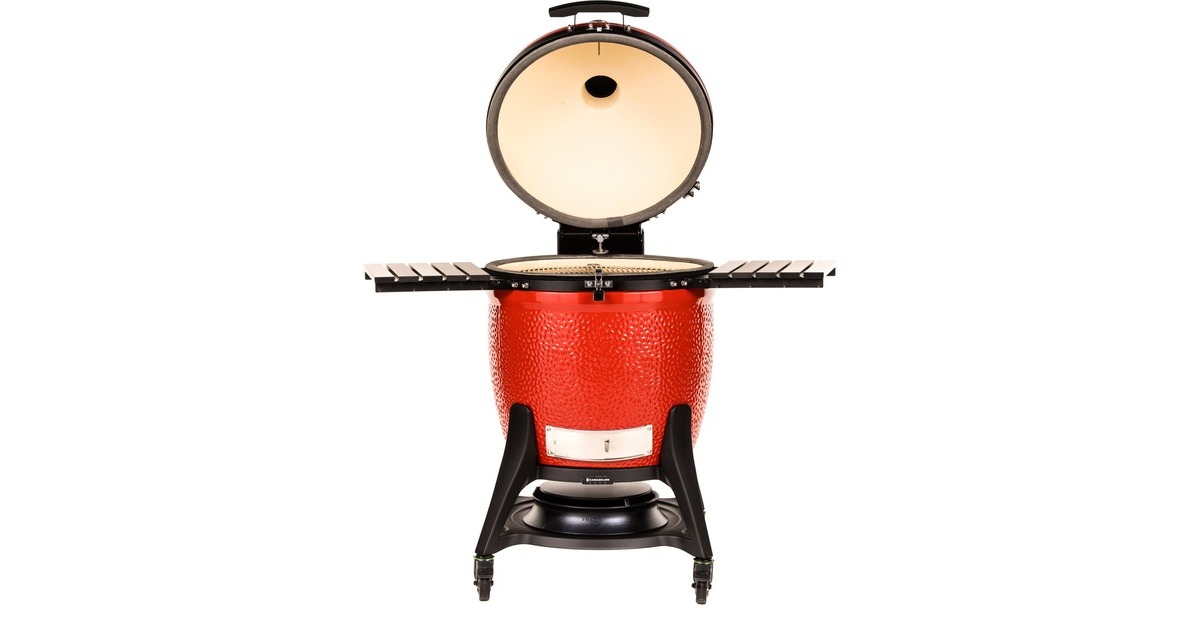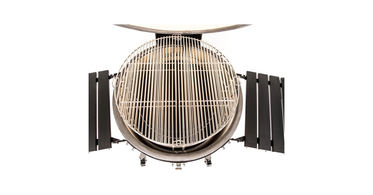 Keramikgrill mit neu gestaltetem Premium-Rollwagen aus verzinktem Stahl mit Ablagefläche, Feststellmechanismus, neues Airlift-Druckluftscharnier reduziert das Hebegewicht des Deckels um 96%. |
