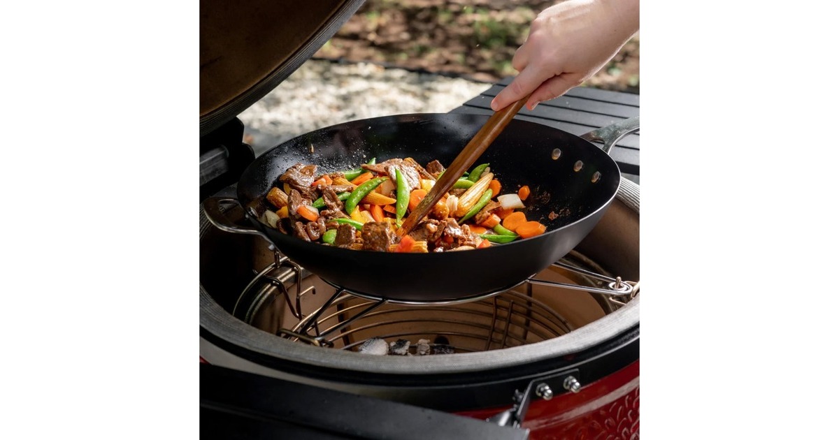 Der Karbonstahl-Wok aus der Karbon Steel Kollektion von Kamado Joe erweitert die Vielseitigkeit jedes Kamado Joe Keramikgrills. Der bereits vorbehandelte Wok aus hochwertigem Antihaft-Karbonstahl eignet sich perfekt für herzhafte Pfannengerichte oder zum Garen und Dünsten und ist ideal für alle, die ihre Kamado Joe-Kochfähigkeiten erweitern möchten. Karbonstahl ist so vielseitig wie Edelstahl und so leitfähig wie Gusseisen. Die beiden Griffe aus Edelstahl sorgen für einfaches Servieren. Der Karbonstahl-Wok eignet sich für jeden Kamado Joe, Big Green Egg oder anderen Holzkohlegrill. Im Kamado Joe entfernt man einfach das zweistufige Divide & Conquer-Gestell, setzt das X-Gestell ein, setzt den Wok auf und kann köstliche Pfannengerichte genießen!Art.-Nr.: 100024046