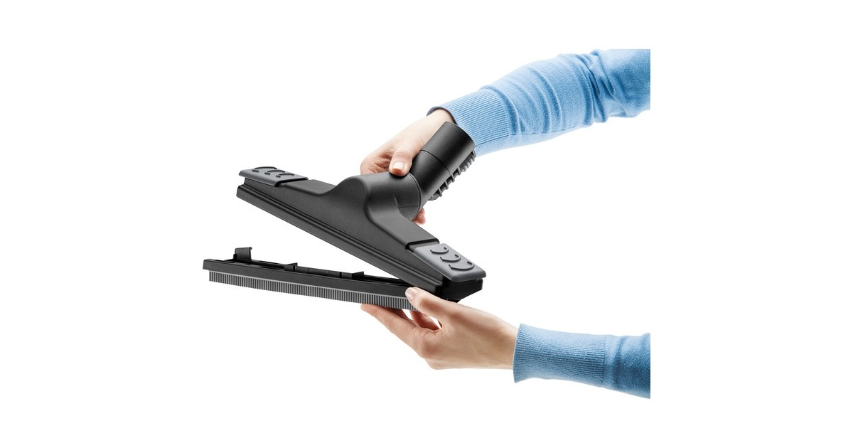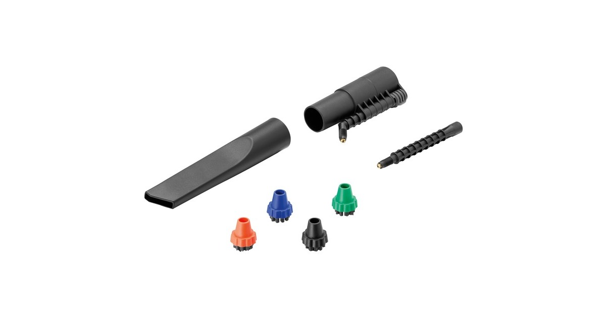 Bodenreinigungsset mit Dampfsaugfunktion: 3 verschiedene Einsätze für Hart- und Teppichboden und 2 Dampfsaugrohre à 0,5 m, Handdüse mit Dampfsaugfunktion, Dampfsaug-Punktstrahldüse, Polsterdüse (klein und groß), Fugendüse, Möbelpinsel, Entschäumer „FoamStop", Messbecher, Reinigungsbürste, Zubehörtasche, Fensterdüse klein und groß, Frotteeüberzug, Rundbürstenset, Bürstenkranzaufsatz, Dampfsaugschlauch mit Handgriff |