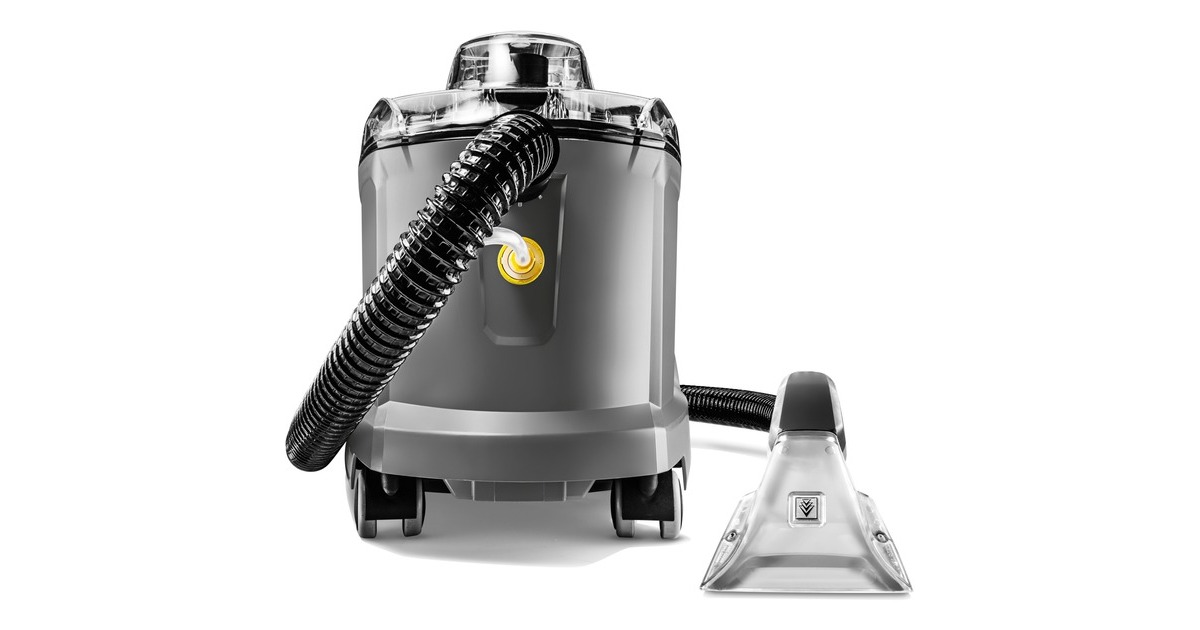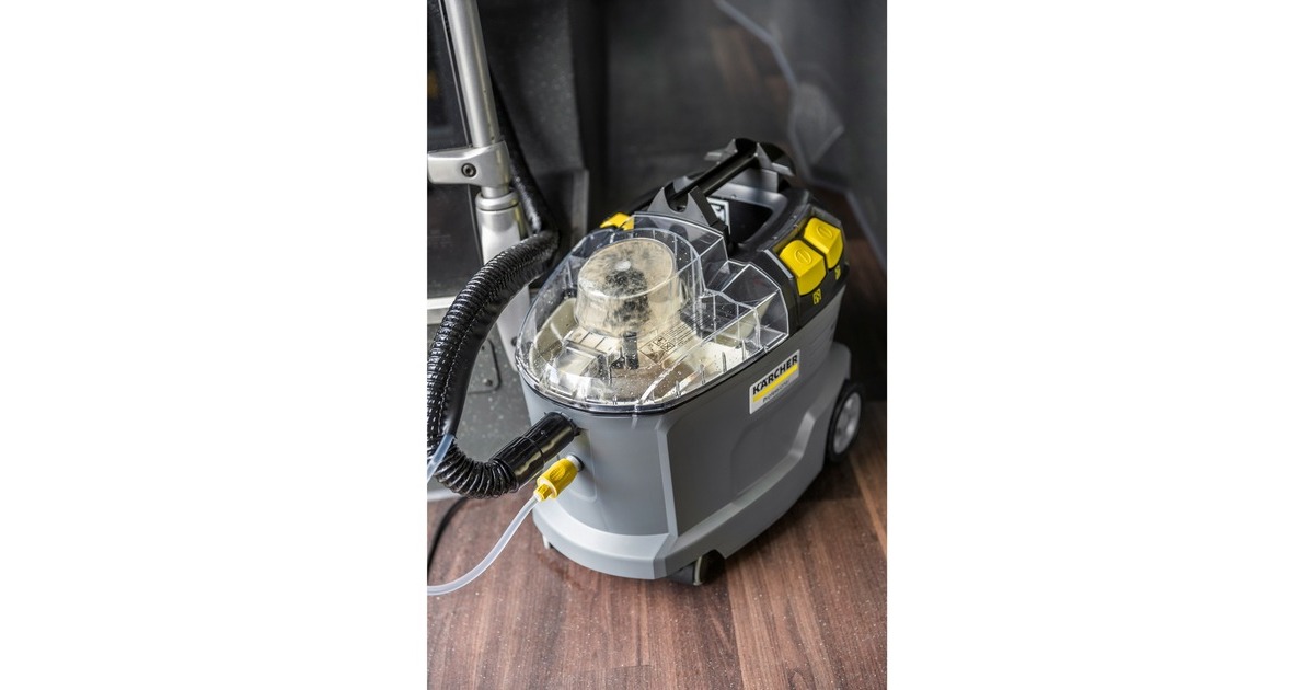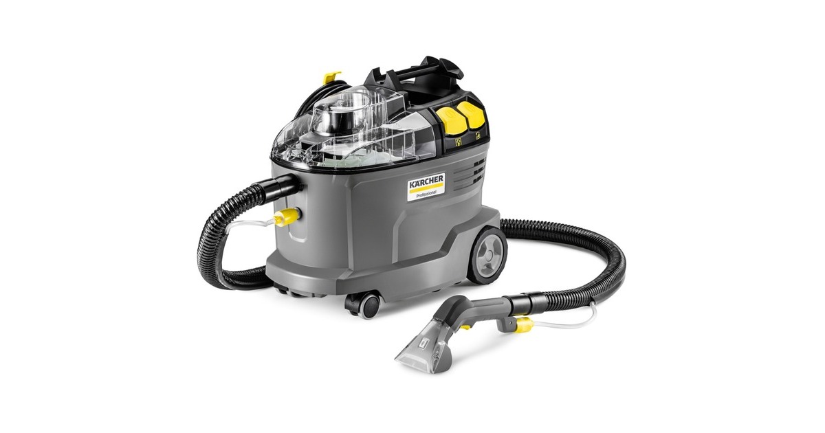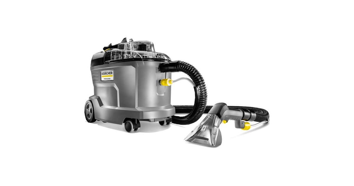 Robust, langlebig, effizient: Der Waschsauger Puzzi 8/1 von Kärcher überzeugt bei der Polsterreinigung und Fleckentfernung auf textilen Flächen mit herausragenden und hygienischen Reinigungsergebnissen und hoher Wirtschaftlichkeit. Dabei sprüht das kompakte Sprühextraktionsgerät die Reinigungslösung tief in die Textilfasern ein und saugt diese anschließend inklusive des gelösten Schmutzes wieder ab. Diese sehr gute Rücksaugleistung sorgt dazu auch für eine schnelle Trocknung und Wiederbegehbarkeit der textilen Flächen – ideal für die hohen Ansprüche von Reinigungsprofis im Hotel- und Gaststättengewerbe oder in der Fahrzeuginnenreinigung. Dazu passt auch die serienmäßige, extra kurze Polsterdüse zur komfortablen, ergonomischen Reinigung von engen Bereichen. Dank seines sehr geringen Gewichts und des ergonomischen Tragegriffs ist der Waschsauger problemlos einhändig zu transportieren. Große, per Hand oder Fuß bedienbare Drucktasten erhöhen dazu den Anwenderkomfort. Zur besseren Sicht auf die Schmutzflotte sind der Gerätedeckel sowie die Handdüse transparent gehalten.Art.-Nr.: 1875793