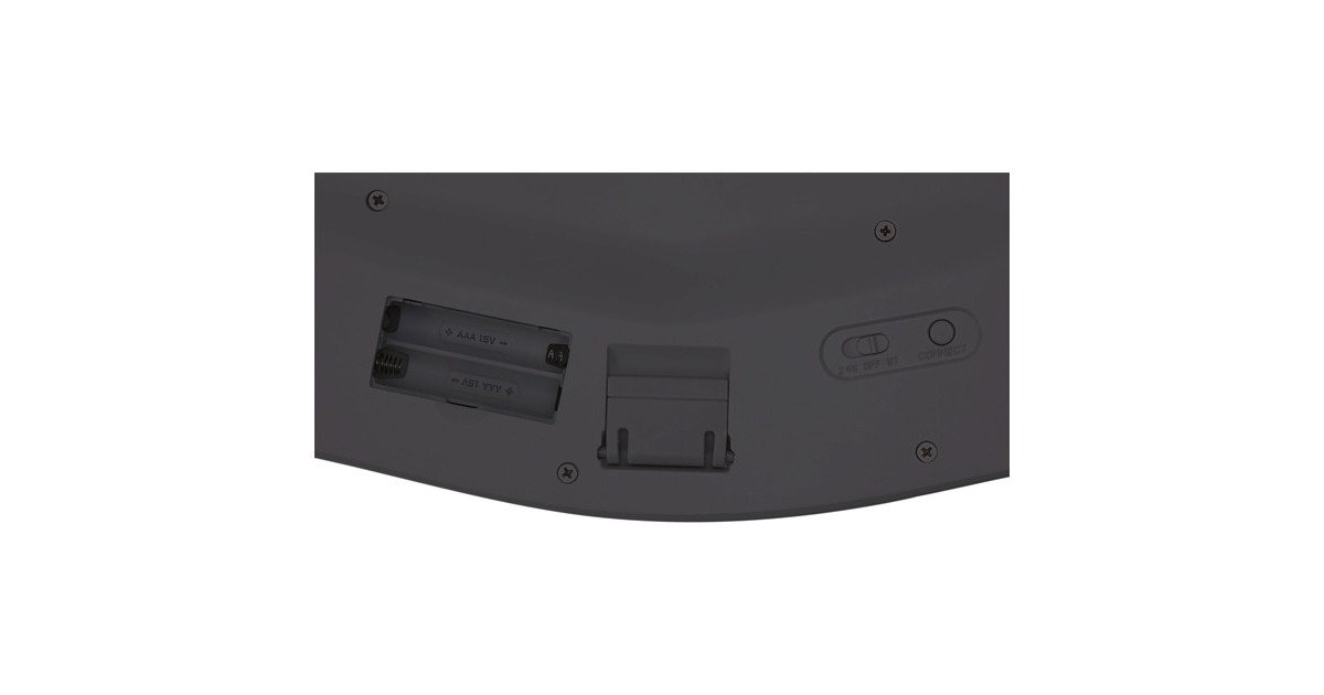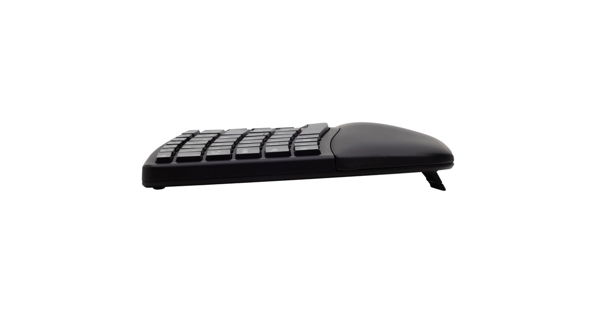 Geteilte und schräg abfallende Tastatur mit verstellbarer entgegengesetzter Neigung | Integrierter Handgelenkauflage | Leiser Tastenanschlag | Spritzwassergeschützte Tasten | 128-Bit-AES-Verschlüsselung | Austauschbarer Receiver |