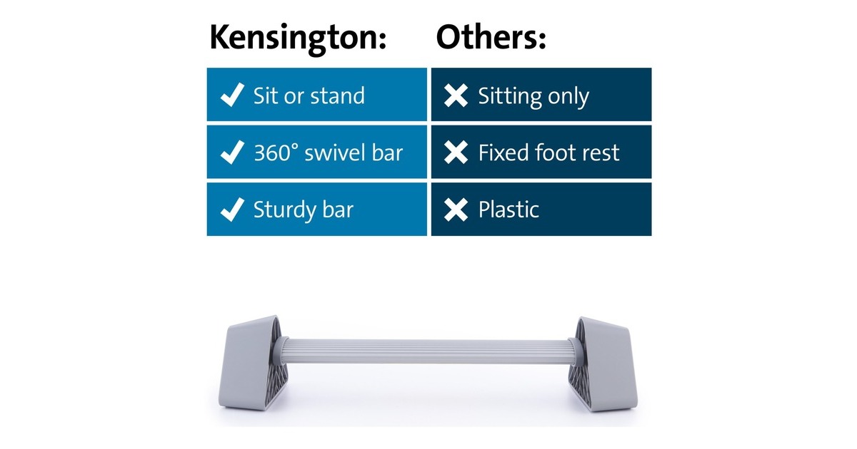 Mit ihrer bequemen, stabilen Unterstützung, der maximalen Traglast von bis zu 136 kg und der 360-Grad-Schwenkstange bietet die Kensington Rocking Fußstütze hohe Ergonomie und fördert Bewegung und Dehnung im Sitzen oder Stehen. Die rutschfeste und rotierende Aluminiumstange verbessert die Durchblutung und entlastet den Druck für ganztägigen Komfort und fördert zusätzlich die Gesundheit. Das schlanke Design mit diskretem, flachem Profil passt zudem in jede Büroumgebung.Art.-Nr.: 1657571