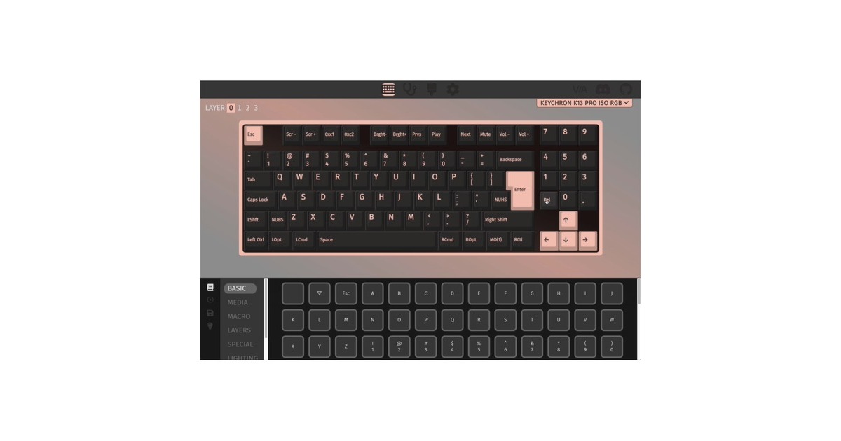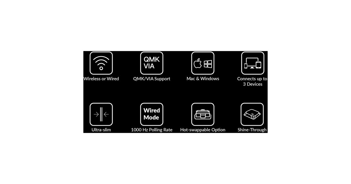 Verbindung mit bis zu 3 Geräten | QMK/VIA-Unterstützung | Durchscheinende ABS-Tastenkappen mit LSA-Profil (Low-Profile spherical-angled) | Rahmen: ABS + Aluminium | Tippwinkel: 3,37º, 4,2º und 6,7º | 22 Beleuchtungsoptionen |