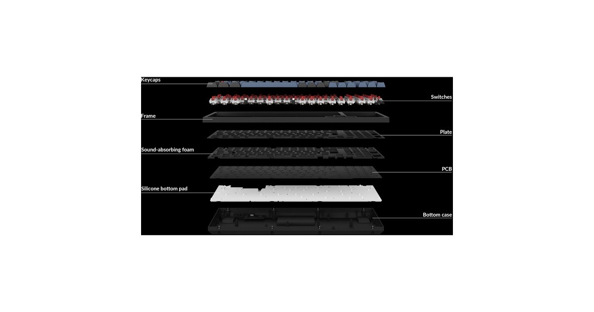 Nach Süden ausgerichtete RGB-Hintergrundbeleuchtung mit 19 Beleuchtungsmodi | Verbindung mit bis zu 3 Geräten | Durchscheinende ABS-Tastenkappen | Eingeschraubte PCB-Stabilisatoren | Vollständige QMK- und VIA-Unterstützung | OSA-Tastenkappen-Profil (OEM-Profil mit sphärischem Winkel) | Tippwinkel: 3º, 7º und 10º | Aluminiumrahmen |